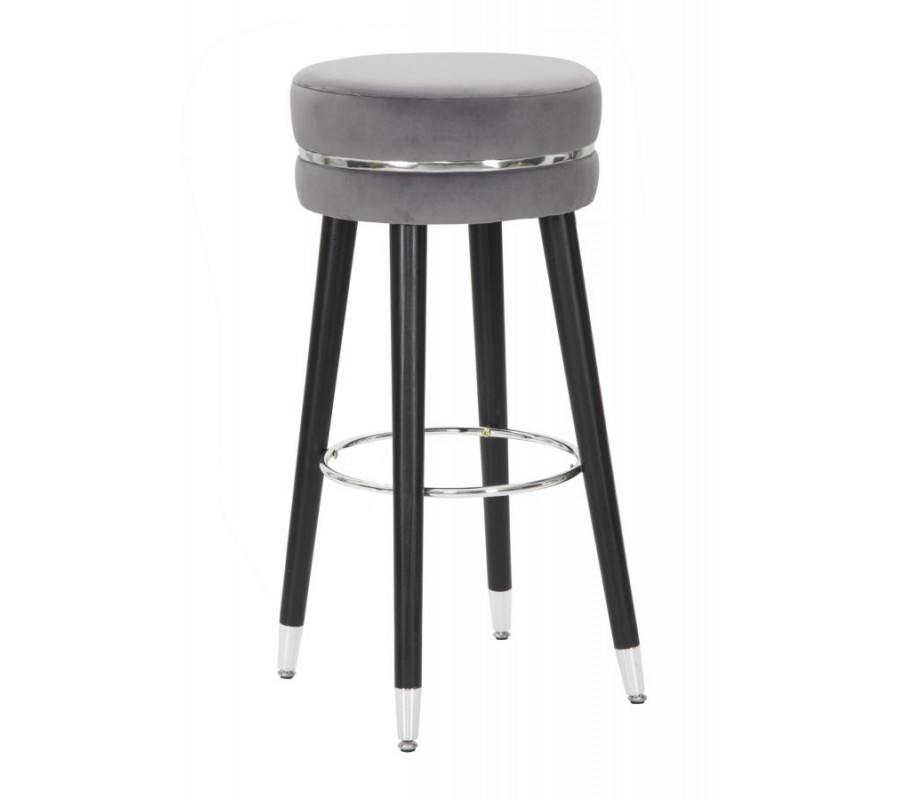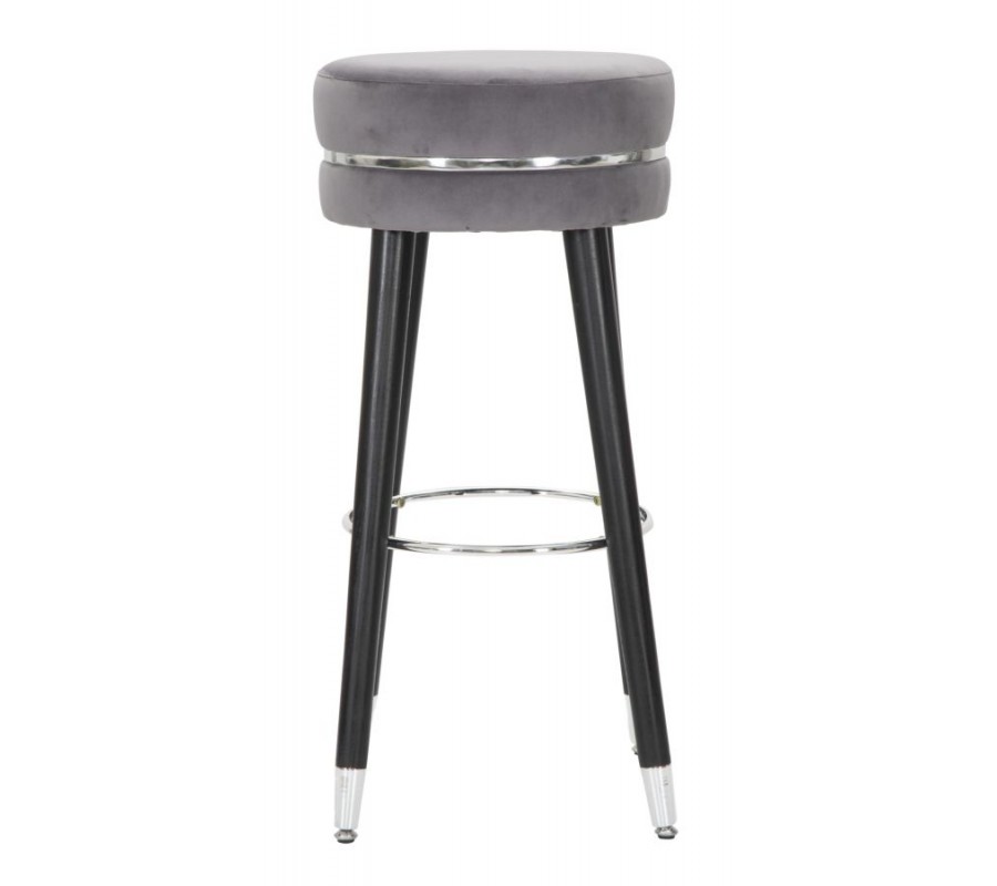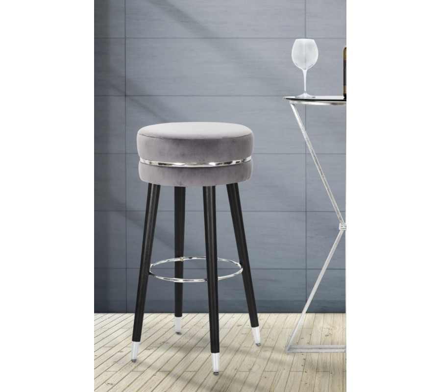 Barová stolička Laurentia s okrúhlym sedadlom je navrhnutá v štýle art deco a glamour, pričom zaujme svojím zamatovým penovým čalúnením v elegantnej sivej farbe. Strieborné detaily zvýrazňujú jej luxusný vzhľad – úzky pásik po celom obvode sedadla, strieborné zakončenie čiernych drevených nôh a kovová opierka na nohy, ktorá zabezpečuje pohodlné sedenie.