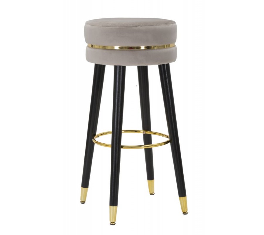 Art deco barová stolička Laurentia so zamatovým sedadlom v sivej farbe so zlatými detailmi a čiernymi kovovými nožičkami 74 cm