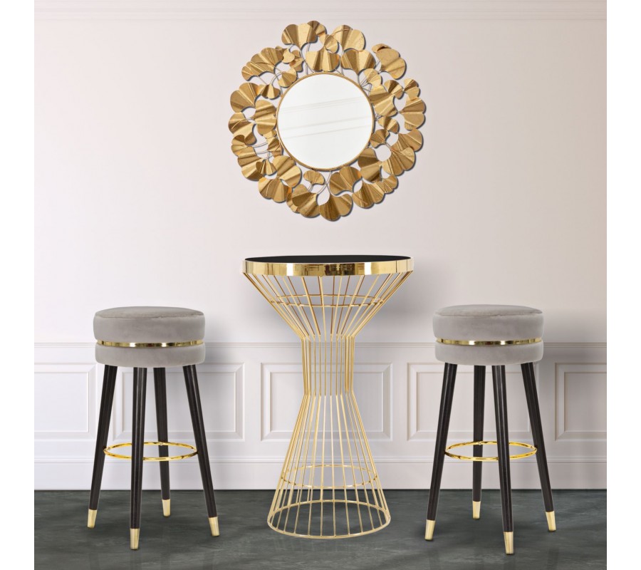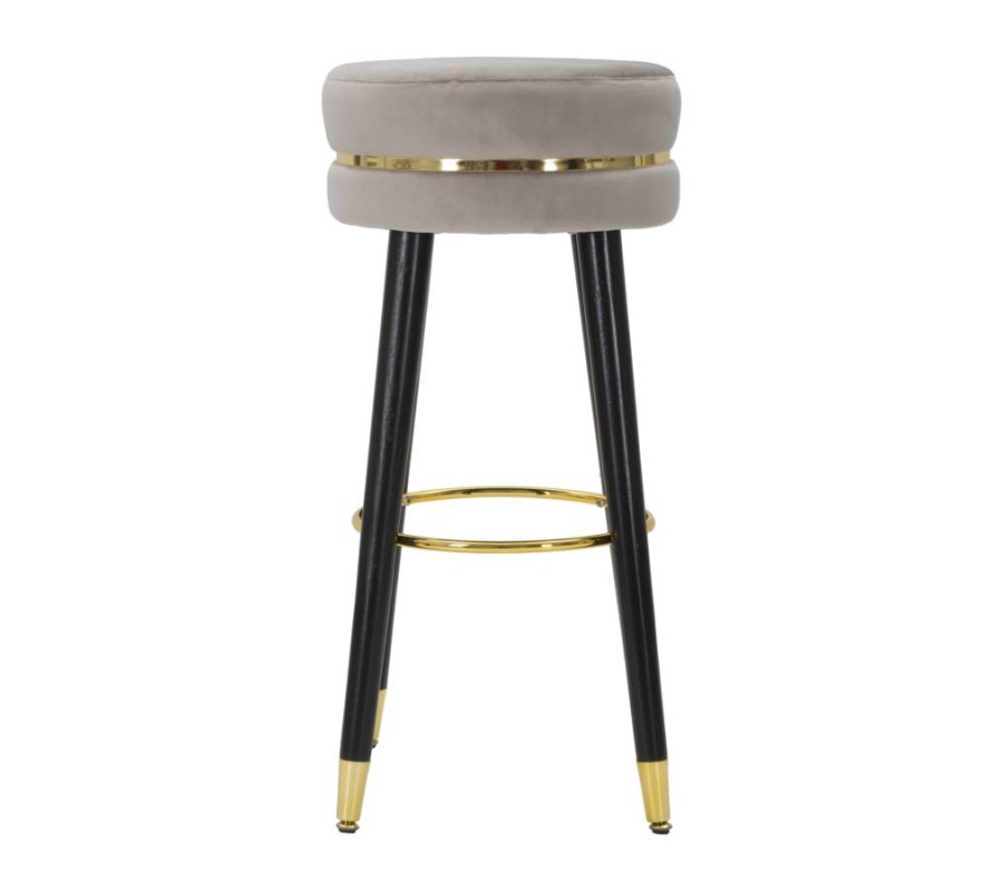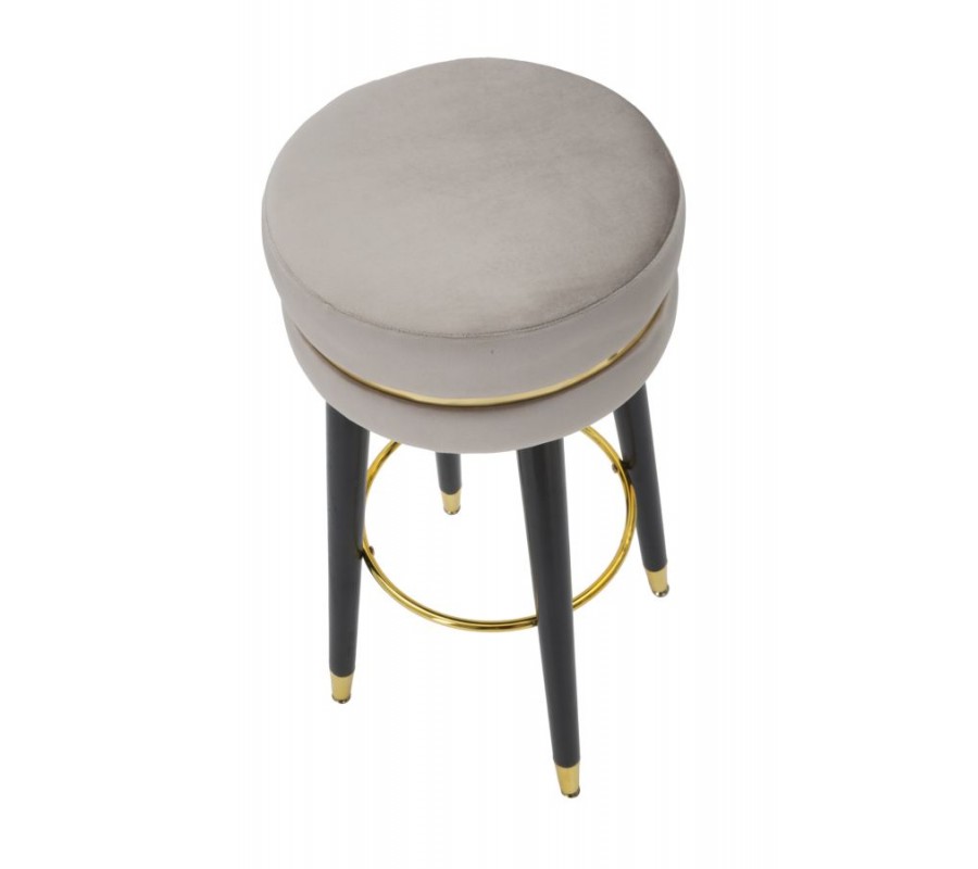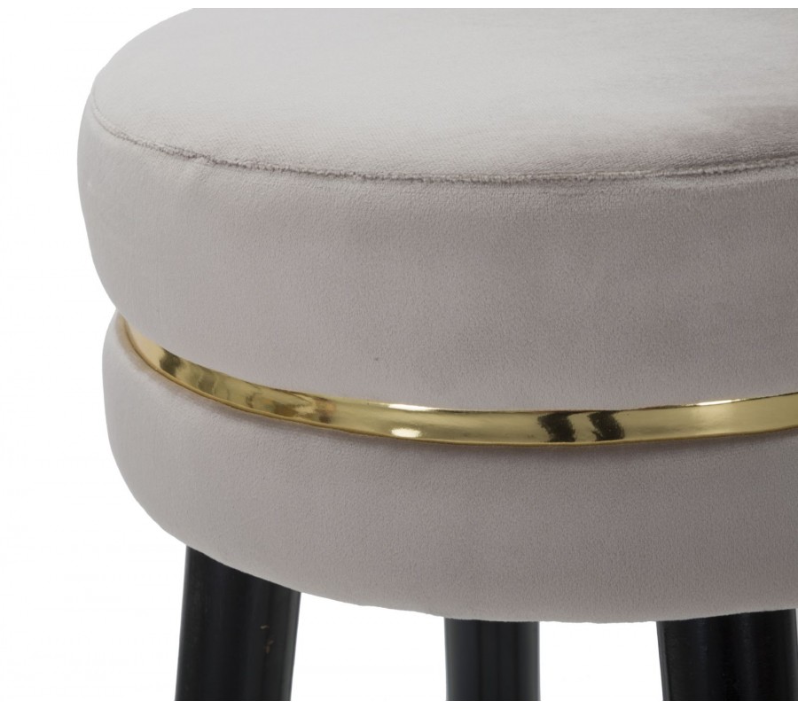 Barová stolička Laurentia v art deco a glamour štýle zaujme svojim okrúhlym čalúneným sedadlom, ktoré je potiahnuté zamatovou látkou v elegantnej sivej farbe. Jemné čalúnenie poskytuje pohodlie, zatiaľ čo luxusné prevedenie podčiarkuje zlatý detail, ktorý sa nachádza v páse okolo sedadla, na zakončení nožičiek a na kruhovej opierke na nohy.