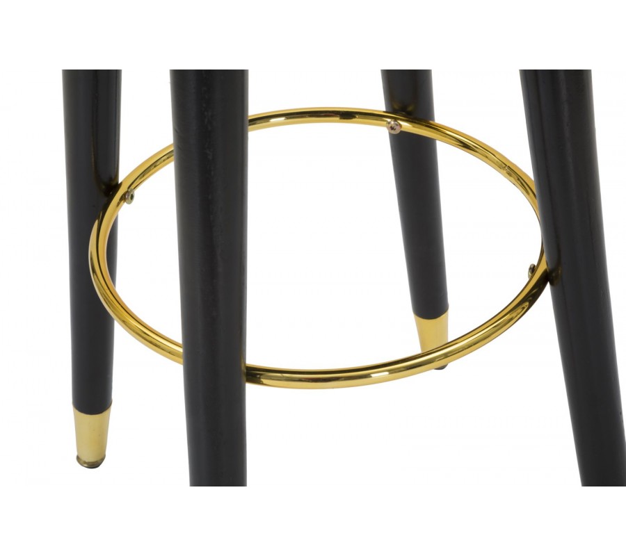 Stolička stojí na štyroch pevných nožičkách v čiernej farbe, ktoré elegantne kontrastujú so zlatými prvkami. Šikmé prevedenie nožičiek odkazuje na retro štýl, no zároveň pôsobí moderne a sofistikovane.