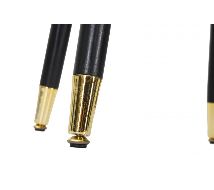 Stolička stojí na štyroch štíhlych nožičkách v čiernej farbe, ktoré majú jemne kónický tvar, čím pridávajú na elegancii. Zlaté zakončenie nožičiek a kruhová opierka na nohy dotvárajú harmonický dizajn.