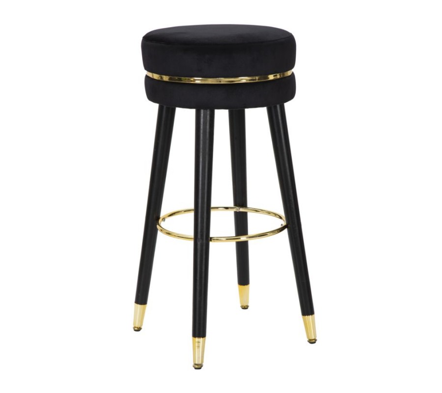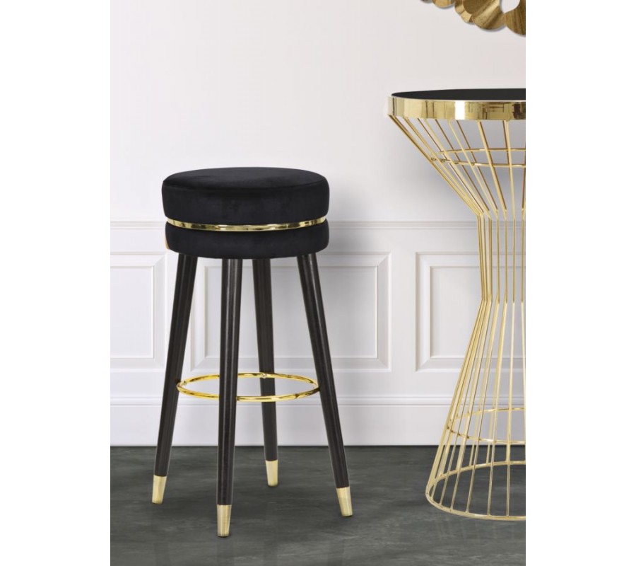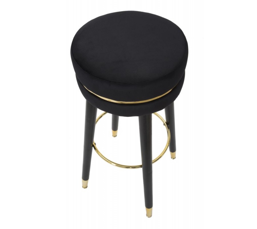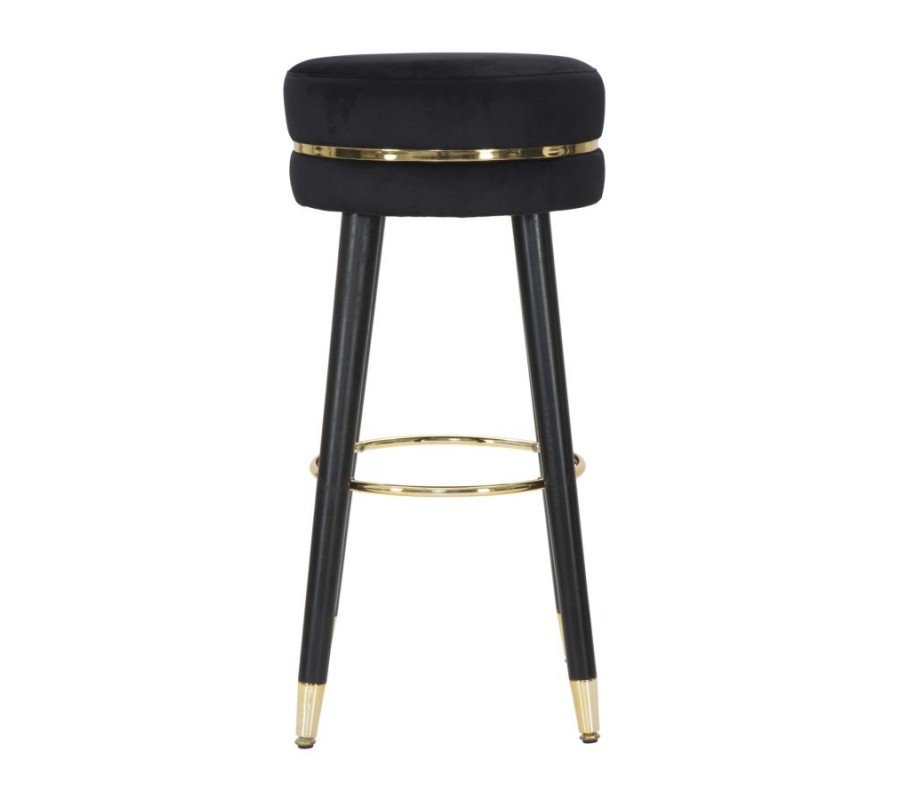 Barová stolička Laurentia v art deco a glamour štýle zaujme svojim okrúhlym čalúneným sedadlom, ktoré je potiahnuté zamatovým penovým poťahom v hlbokej čiernej farbe. Mäkké sedadlo dodáva pohodlie, zatiaľ čo zlaté detaily podčiarkujú luxusný vzhľad.