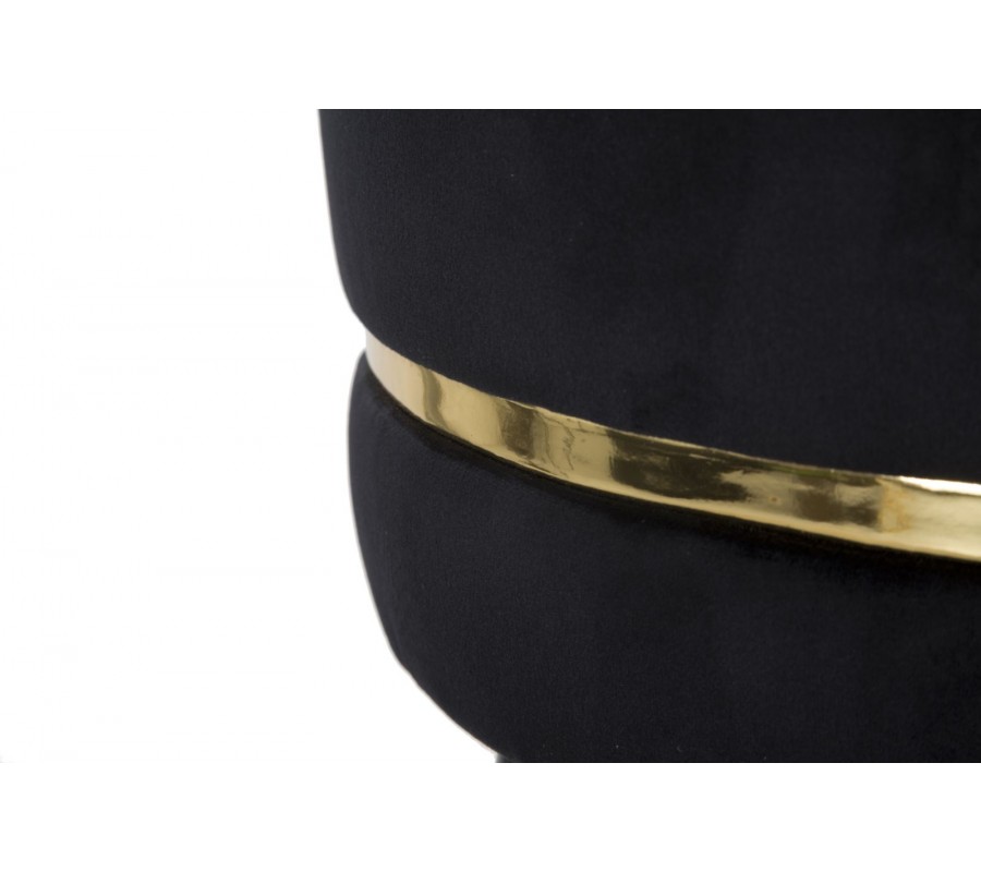 Zlaté prvky sa nachádzajú na obvode sedadla, na kovovej opierke na nohy a na zakončení nožičiek. Táto kombinácia čierneho čalúnenia a zlatých akcentov vytvára sofistikovaný kontrast, ktorý je typický pre glamour interiéry.