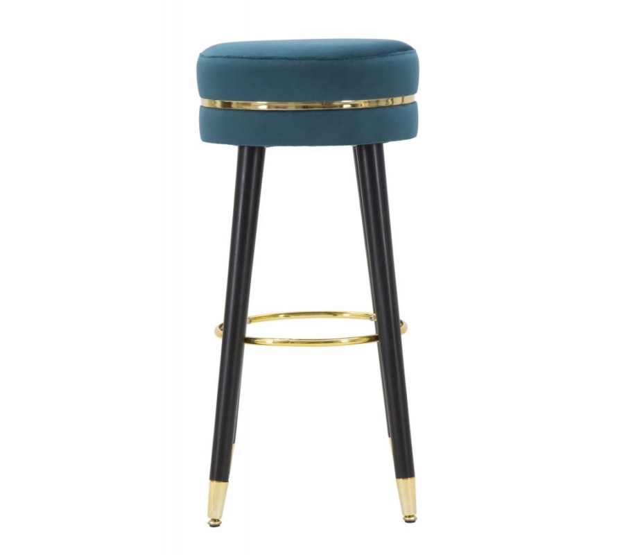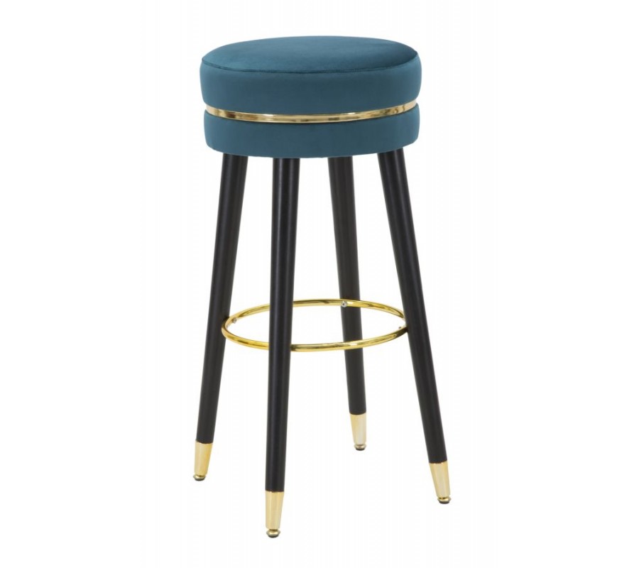 Art deco barová stolička Laurentia s modrým zamatovým sedadlom so zlatým detailom a čiernymi kovovými nožičkami 74 cm