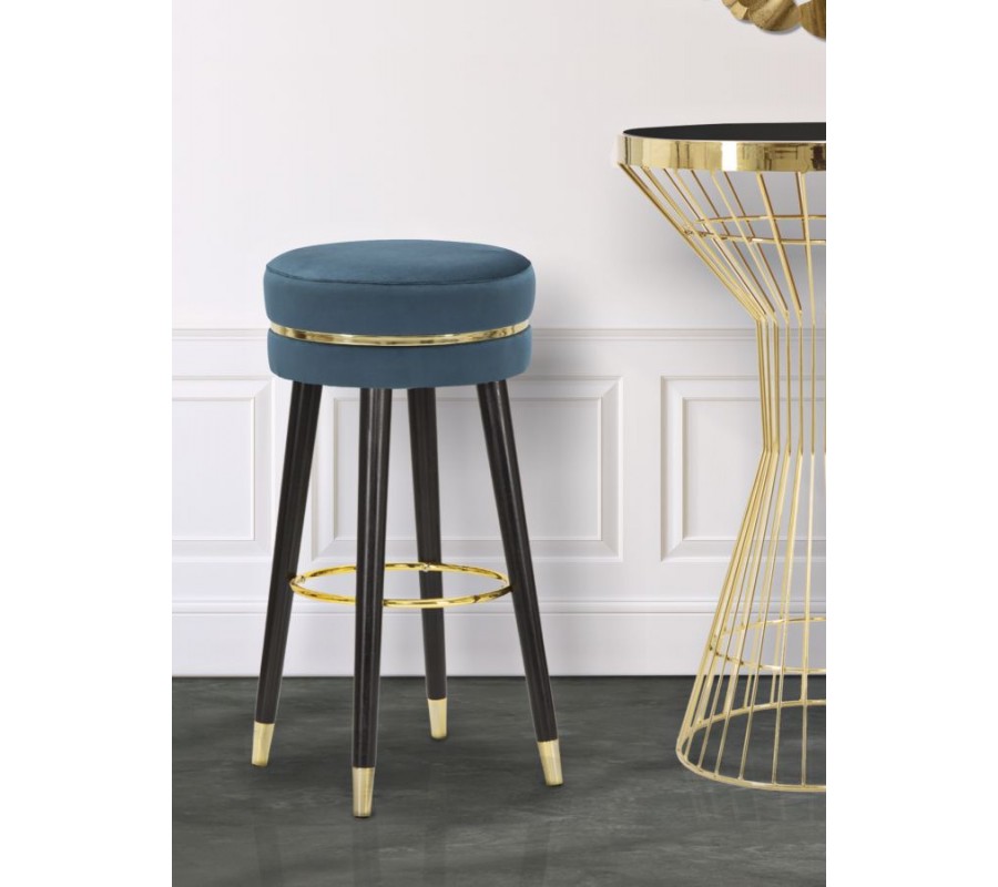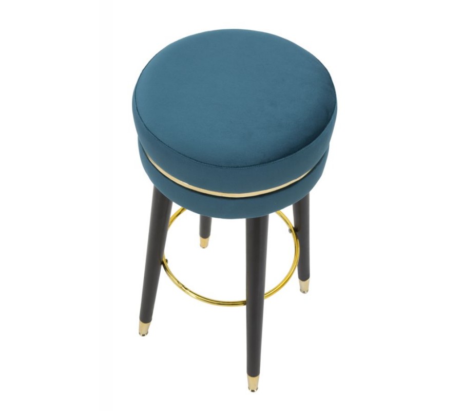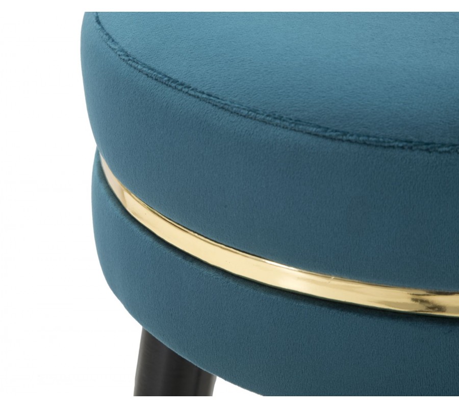 Barová stolička Laurentia v art deco a glamour štýle kombinuje luxusný vzhľad s nadčasovou eleganciou. Okrúhle sedadlo je bohato čalúnené so zamatovým poťahom v petrolejovej modrej farbe, ktorá dodáva stoličke výrazný a sofistikovaný nádych. Mäkké čalúnenie zabezpečuje pohodlie pri dlhšom sedení.