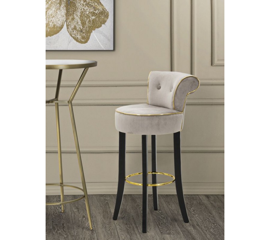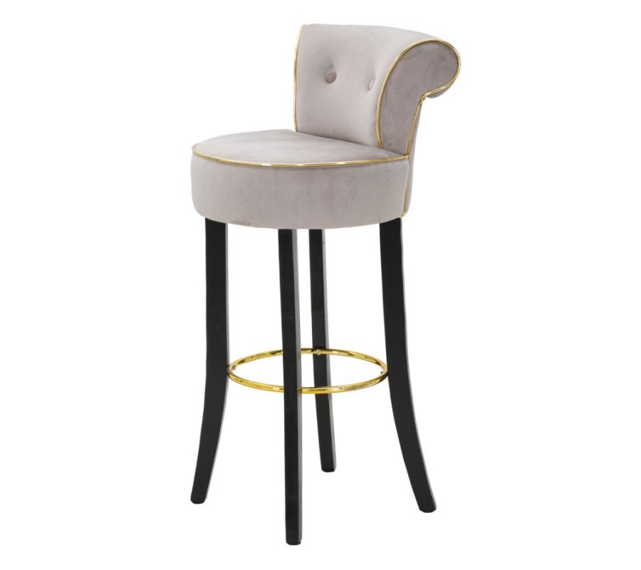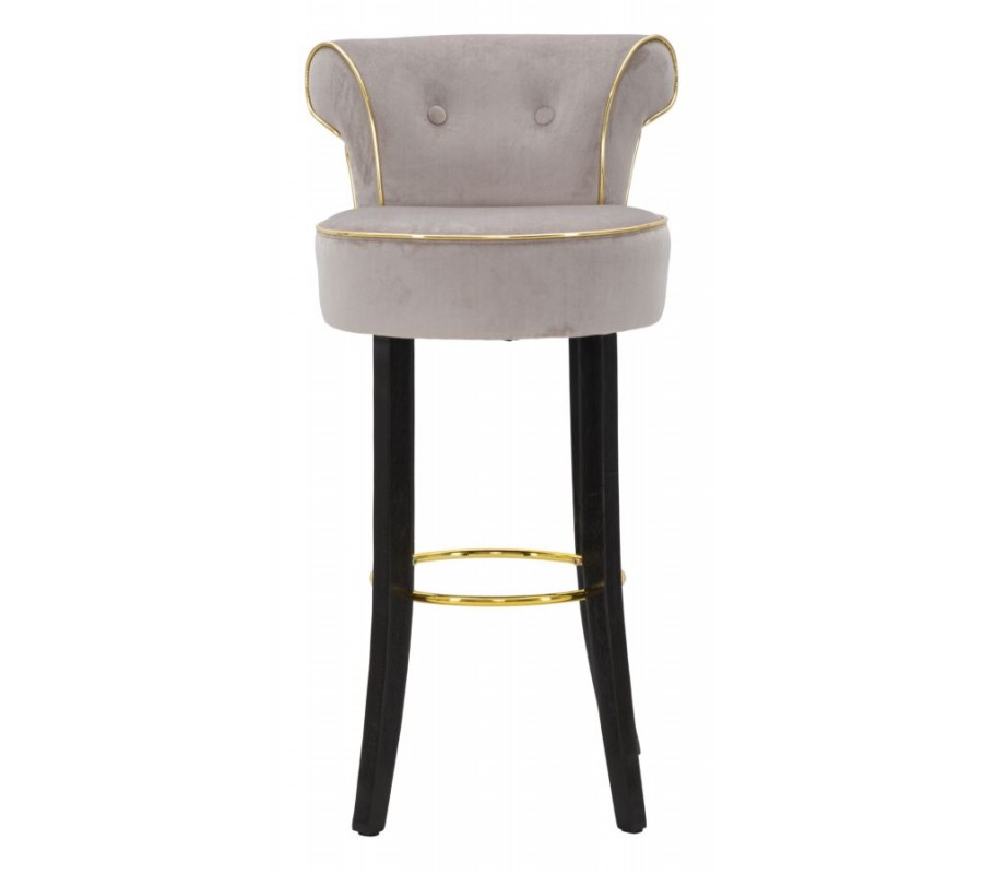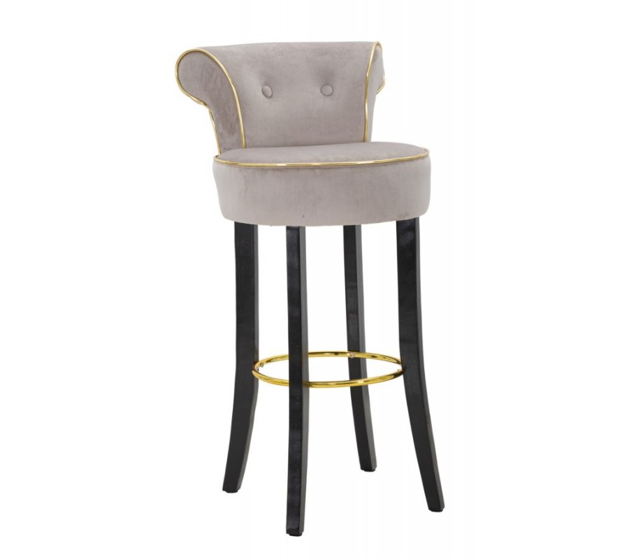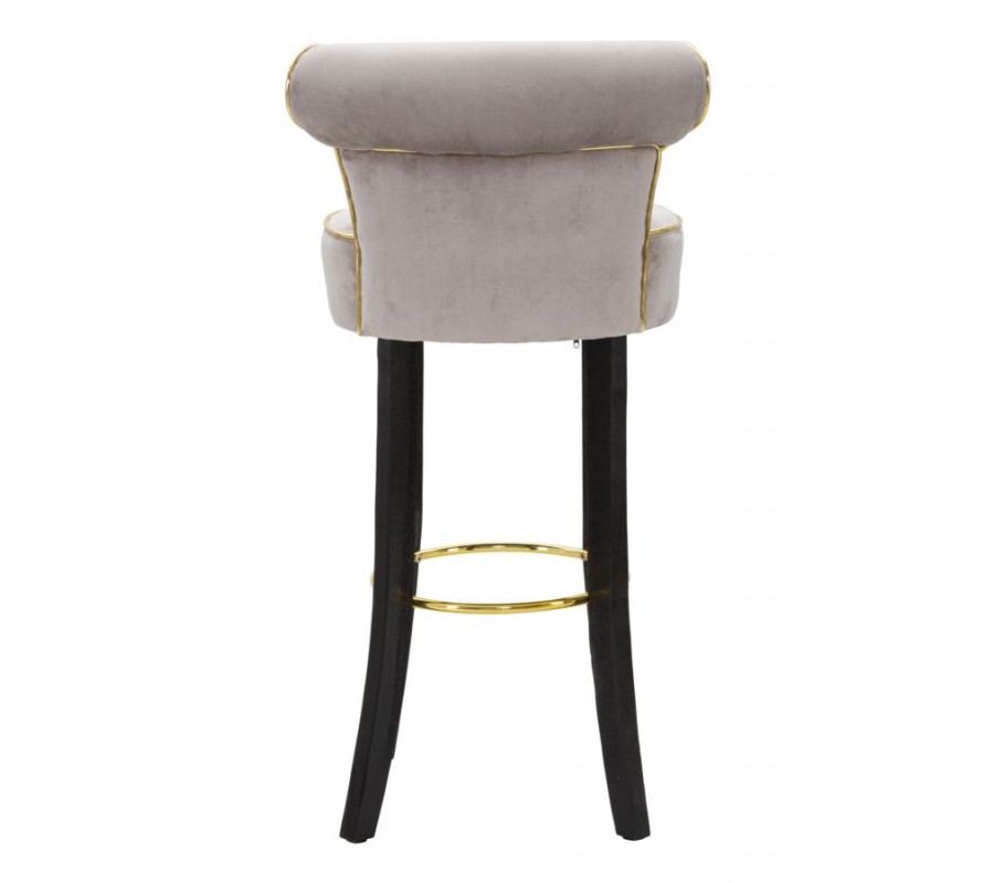 Dizajnová art deco sivá barová stolička Vivienne s čiernymi nožičkami so zahnutou opierkou so zlatými detailmi 96 cm