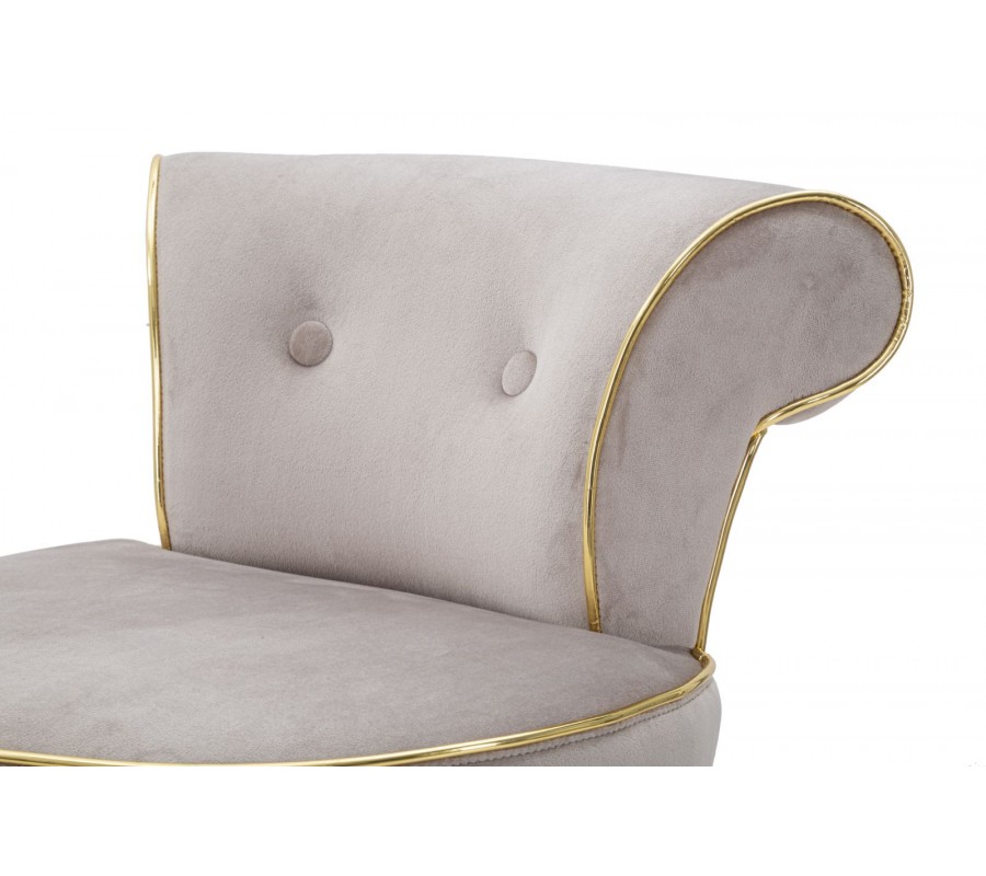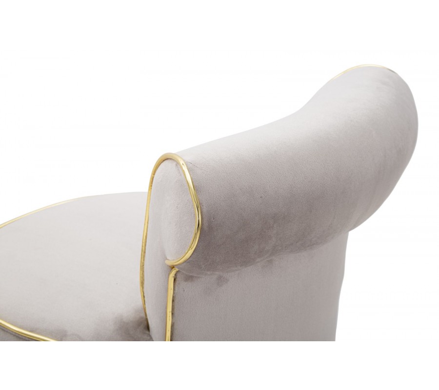 Konštrukcia je vyrobená z masívneho dreva, ktoré zaisťuje stabilitu a dlhú životnosť. Sedacia časť disponuje výplňovou penou pre maximálny komfort a je potiahnutá jemnou sivou textíliou so semišovým povrchom, ktorá je príjemná na dotyk a dodáva stoličke noblesný charakter. Obvod sedadla a opierky je zvýraznený zlatým lemovaním, ktoré vytvára kontrast a podčiarkuje jej luxusný vzhľad.