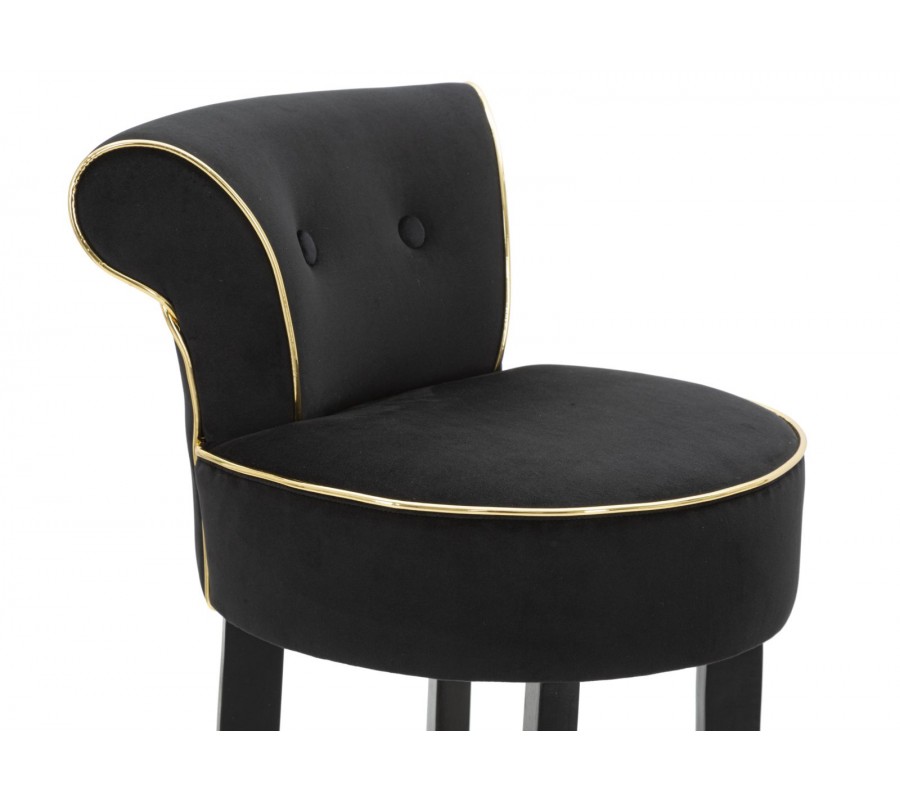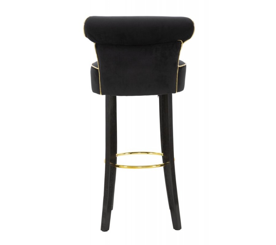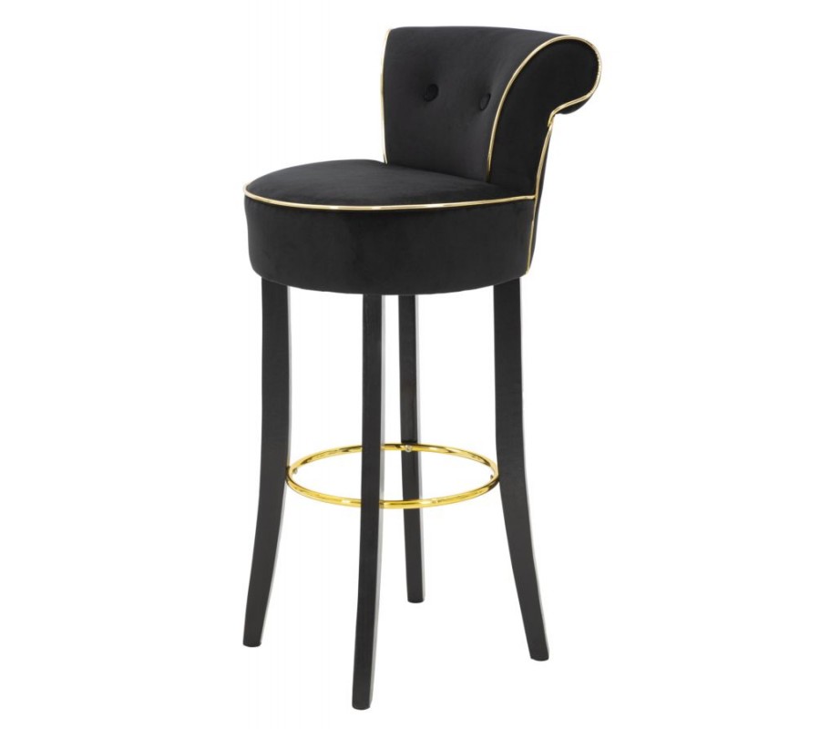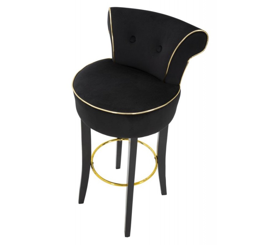 Dizajnová art deco čierna barová stolička Vivienne so zahnutou opierkou so zlatými detailmi 96 cm