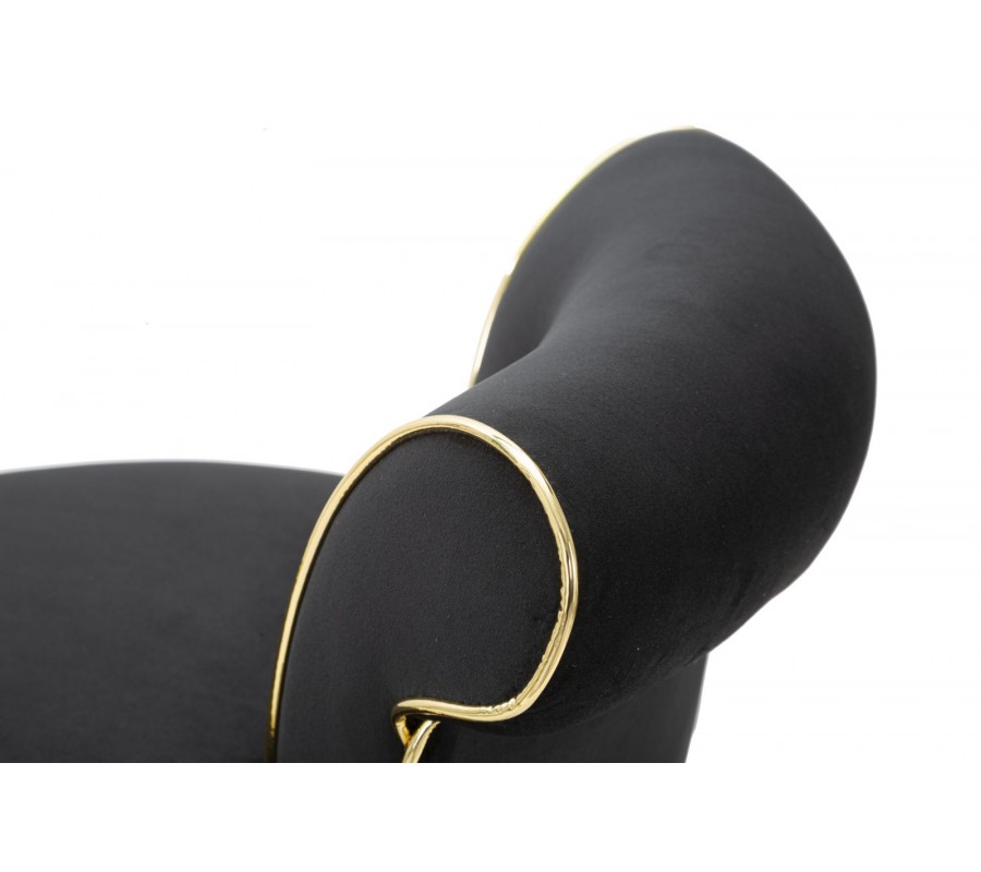 Štíhle nožičky z masívneho dreva v čiernej povrchovej úprave majú mierne zahnutý tvar, ktorý opticky odľahčuje konštrukciu a zároveň zabezpečuje stabilitu. Ich jemné zužovanie smerom nadol pridáva stoličke nadľahčený vzhľad. Funkčným a zároveň estetickým prvkom je zlatý kovový kruh, ktorý slúži ako opora na nohy a zároveň harmonicky dopĺňa zlaté detaily čalúnenia.