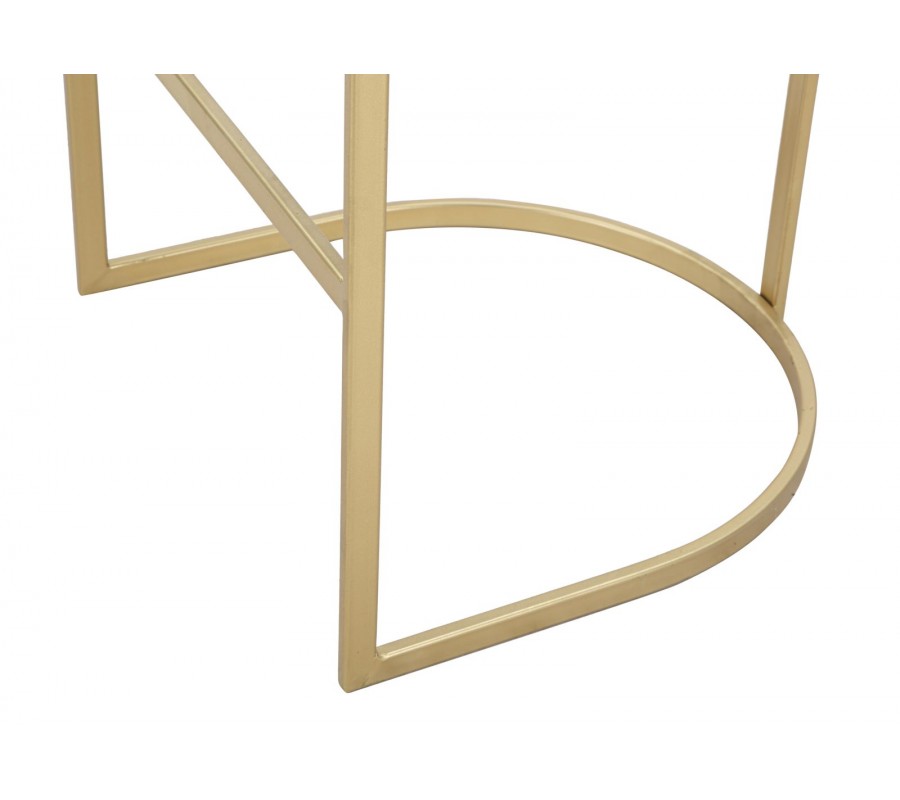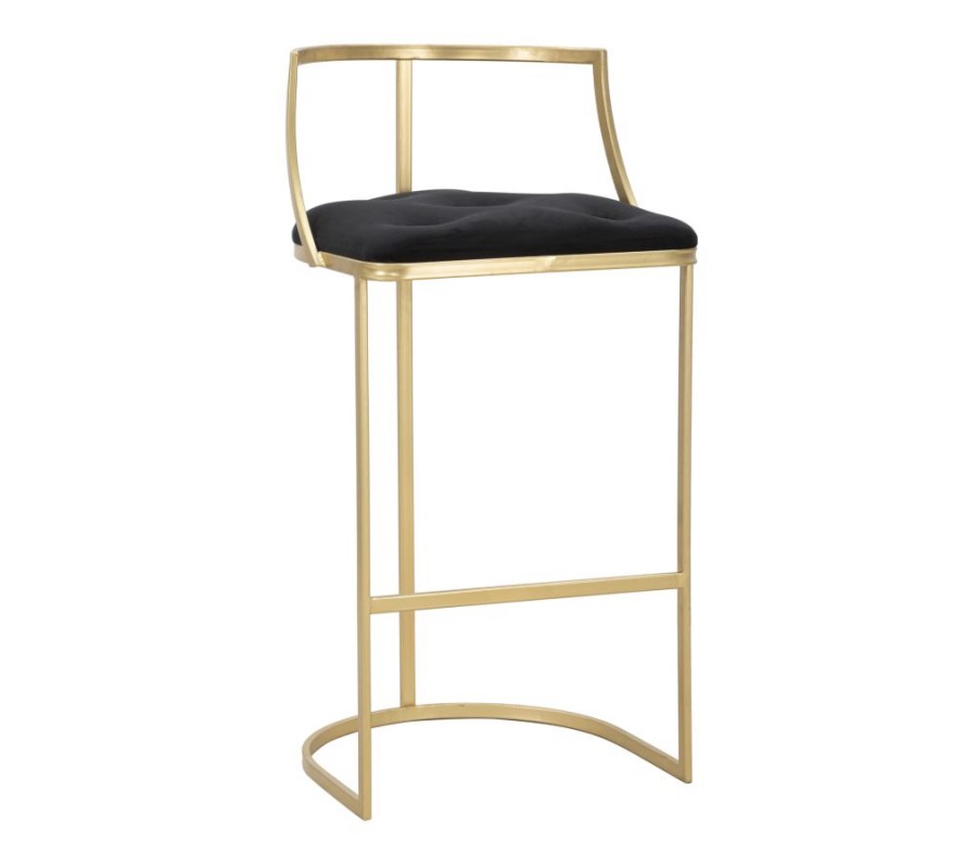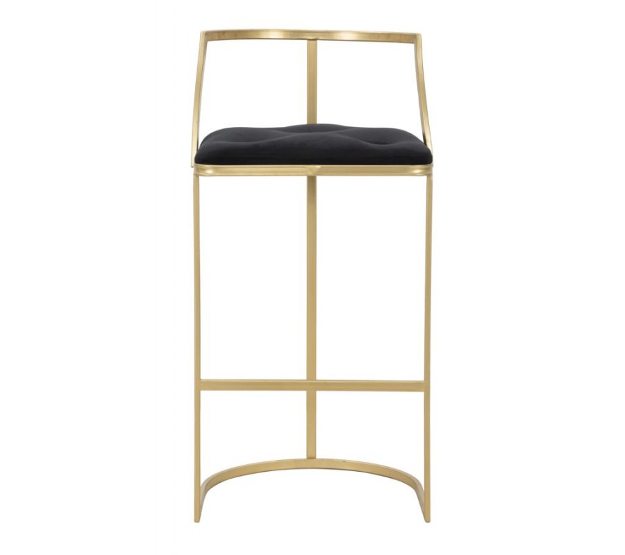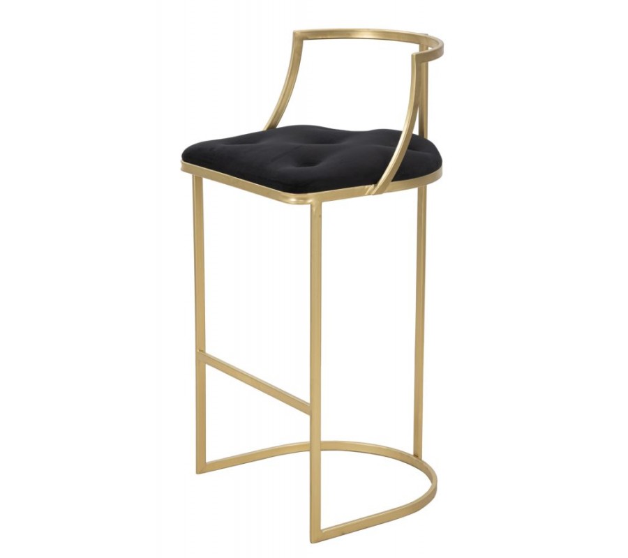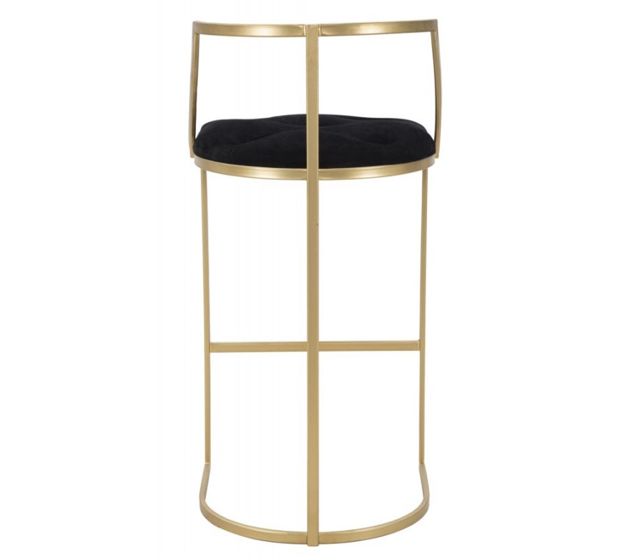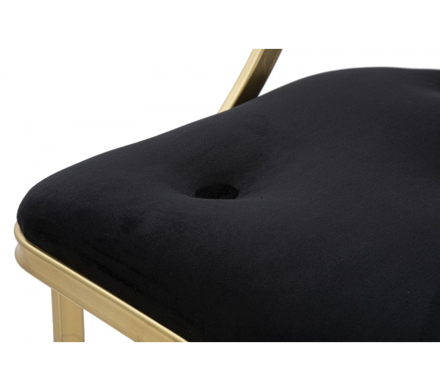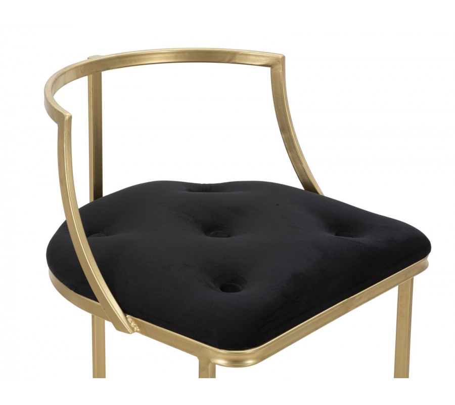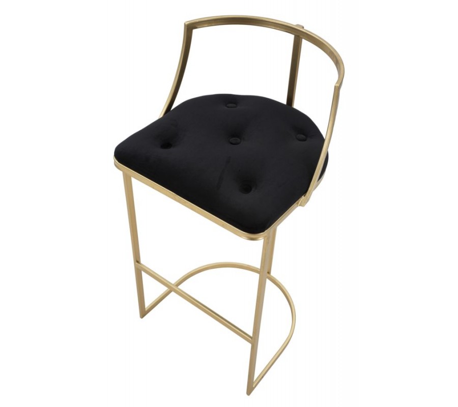 Barová stolička má polkruhový pôdorys, so zaoblenou zadnou stranou. Základ tvorí pevná kovová konštrukcia v zlatom prevedení. Sedadlo je čalúnené, so zamatovým poťahom v čiernej farbe, ktorý je príjemný na dotyk a zaručí vám pohodlné sedenie. Dekoratívne prešívanie s hlbokými okrúhlymi gombíkmi pripomína chesterfield nábytok a podčiarkuje luxusný vizuál.