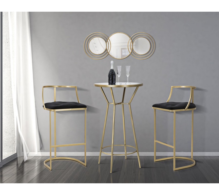 Barová stolička Izmir prinesie do vašej jedálne či kuchyne glamour a eleganciu art deco štýlu. Kombinácia zlatej a čiernej farby pôsobí sofistikovaným dojmom a geometrická konštrukcia robí z tohto nábytku zaujímavý vizuálny prvok miestnosti.