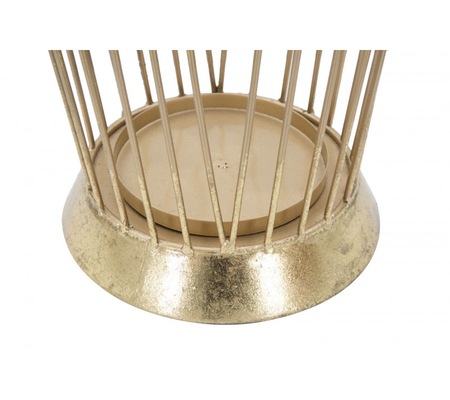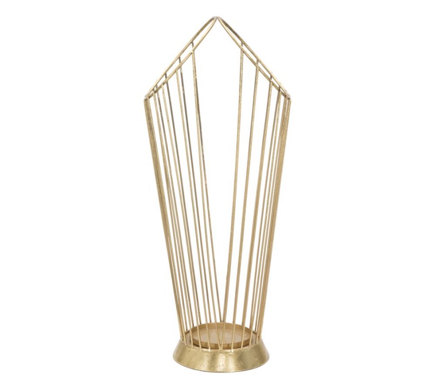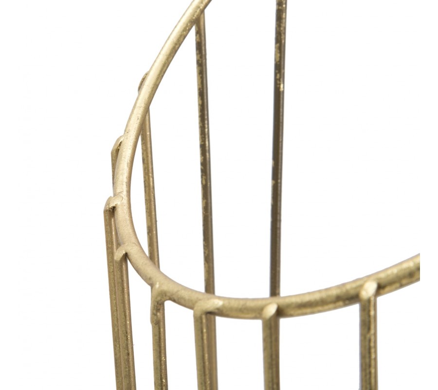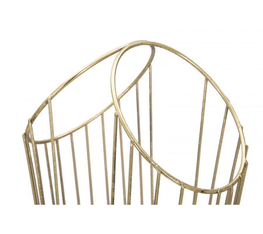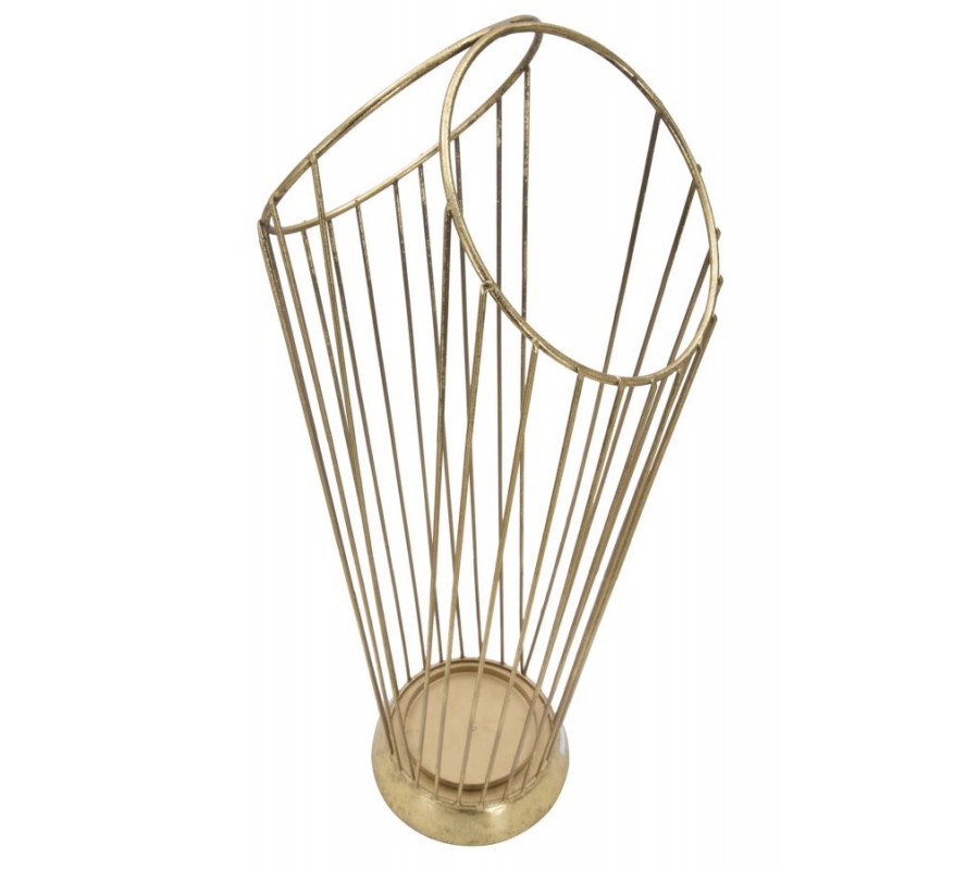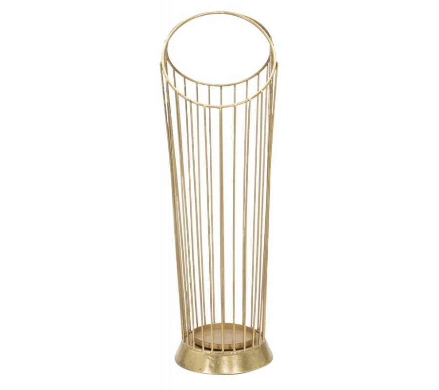 Dizajnový glamour stojan na dáždniky Cassia je vyrobený z kovu v zlatej farbe s jemnou vintage patinou, čo mu dodáva elegantný a sofistikovaný vzhľad. Jeho okrúhly rám je tvorený sústavou tenkých kovových tyčí, ktoré sa v hornej časti spájajú do dvoch kruhových rámov, vytvárajúc harmonický a vzdušný dizajn.