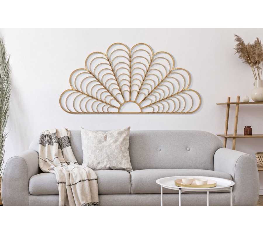 Dizajnová nástenná dekorácia Pavone v tvare polovičného kvetu prinesie do interiéru eleganciu a jemnosť art deco štýlu. Táto dekorácia je vyrobená z kovu v zlatej farbe s lesklým povrchom, ktorý odráža svetlo a dodáva priestoru luxusný nádych.