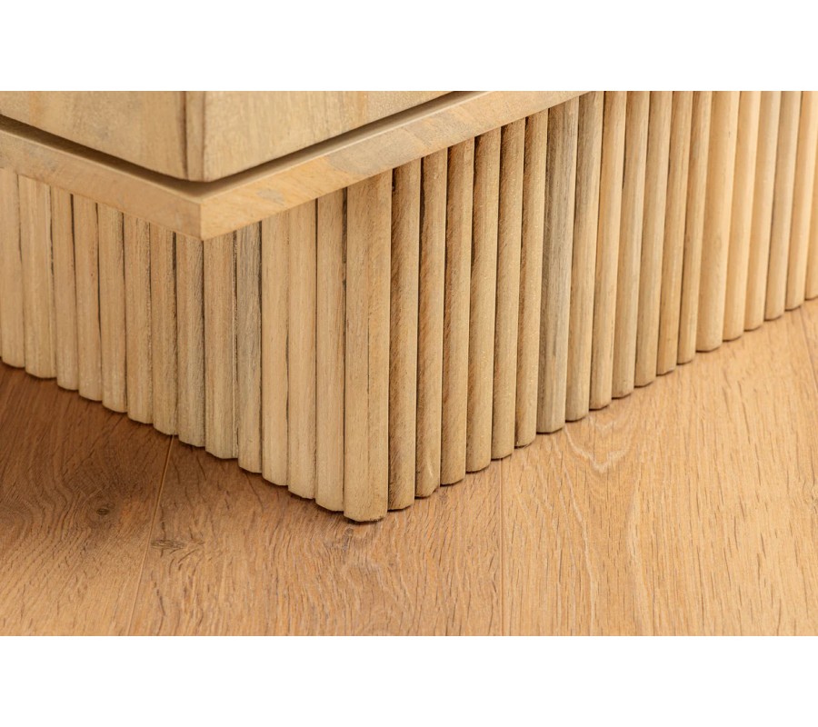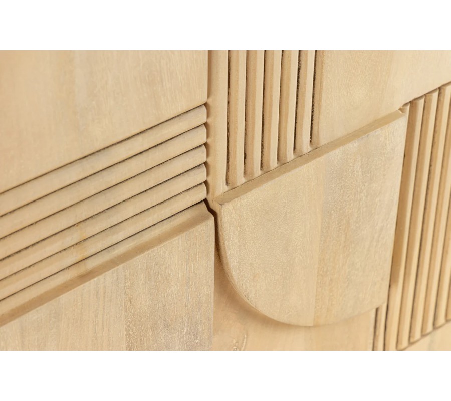 Luxusná barová skrinka Sonia zaujme svojím obdĺžnikovým tvarom a masívnym prevedením z kvalitného mangového dreva v svetlo hnedej farbe. Prednú stranu dvoch masívnych dvierok zdobí výrazný geometrický reliéf – kombinácia vyrezávaných kruhov, polkruhov, štvorcov a obdĺžnikov, ktoré vytvárajú hravý moderný dekor s umeleckým nádychom. Dvierka sú vybavené dvomi plochými úchytkami, ktoré sú takmer neviditeľne zapustené do hornej časti prednej strany, čím si skrinka zachováva minimalistický vzhľad.