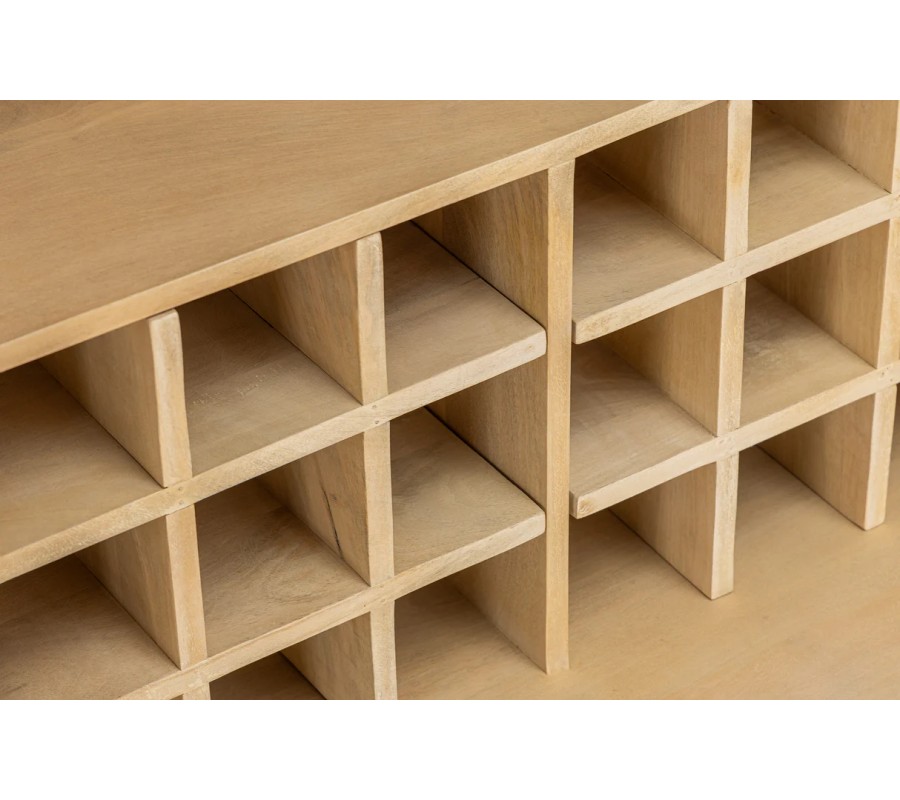 Po otvorení skrinky sa odkryje funkčne členený interiér, ideálny na uskladnenie vína, pohárov aj príslušenstva. Na vnútornej strane každych dvierok sa nachádzajú dve police na odloženie fliaš. V hornej časti vnútra je 7 kovových stojanov na poháre na stopke, doplnených o ďalších 8 kusov na vnútorných stranách dvierok. Pod nimi sú dve praktické zásuvky na otvárače, obrúsky alebo drobné doplnky. V spodnej časti skrinky sa nachádza priestranný vínny stojan pre 24 fliaš usporiadaný v klasických štvorcových priehradkách. Celá skrinka je postavená na výraznej podstave z vertikálne ukladaných drevených lamiel, ktoré ladia s jej prírodným povrchom a dodávajú jej eleganciu.