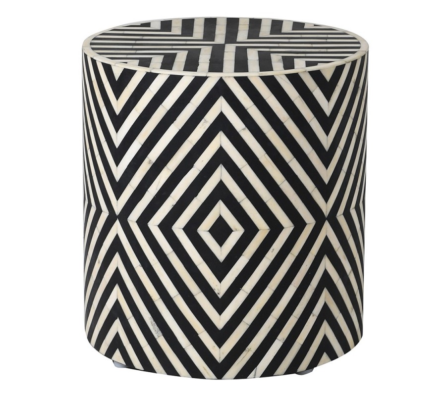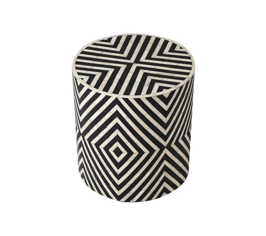 Taburetka Daytona prinesie do vašej obývačky neprehliadnuteľný dekoratívny element. Nadčasová kombinácia čiernej a bielej v spojení s geometrickou intarziou dodáva nábytku luxusný art deco vizuál.