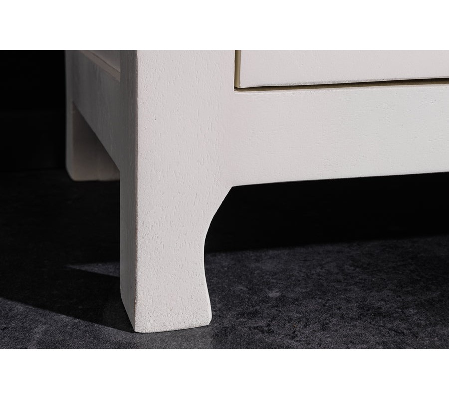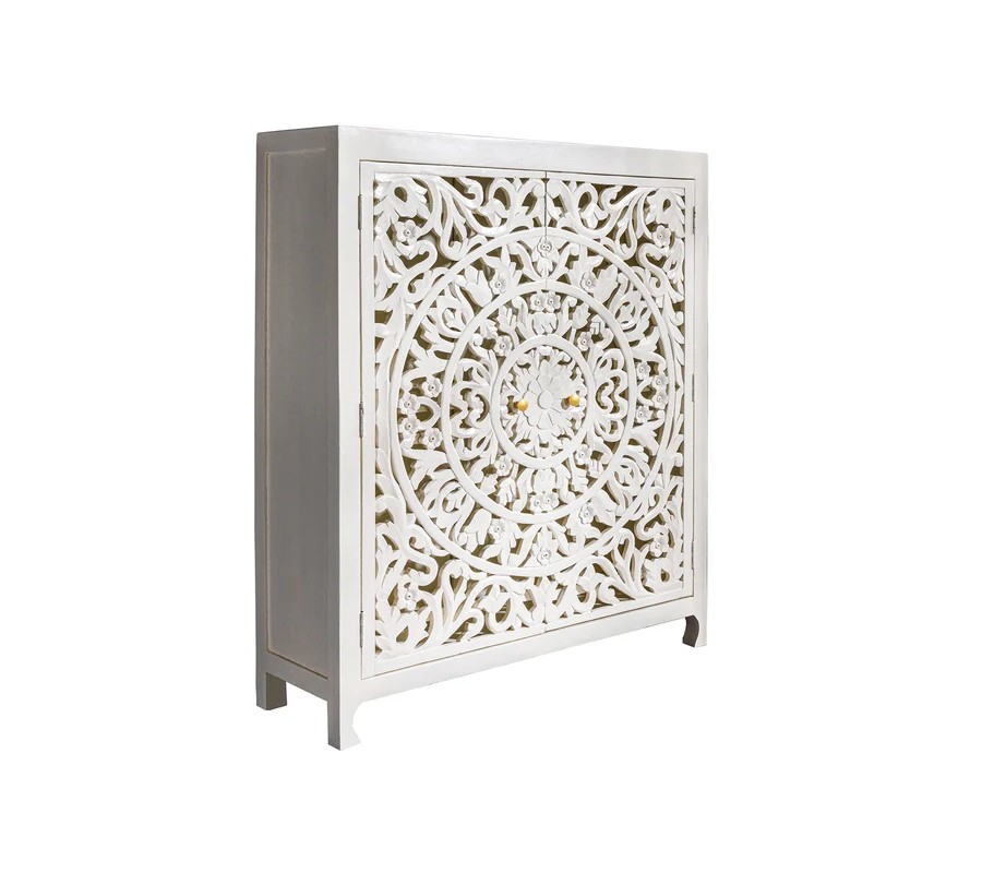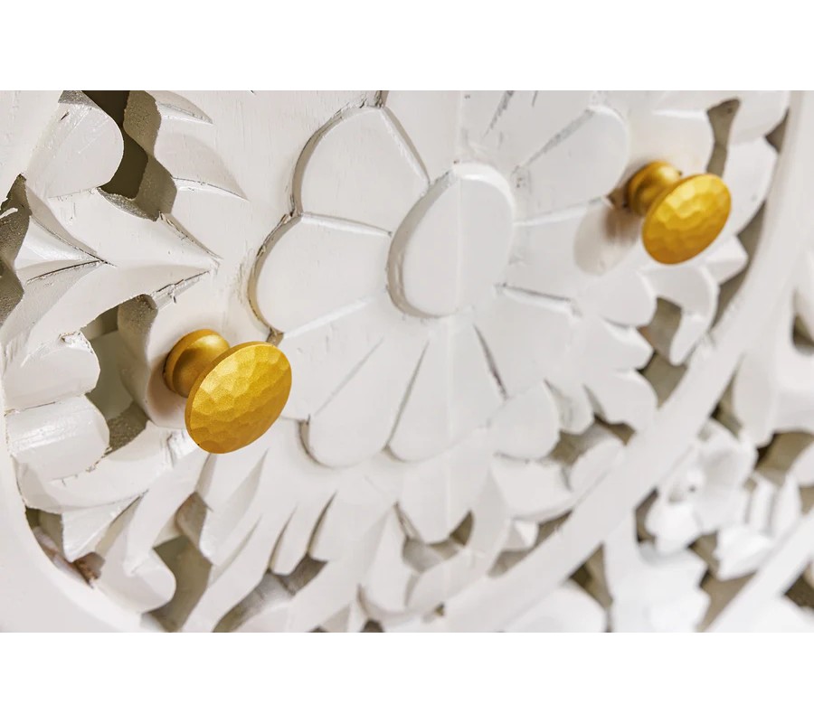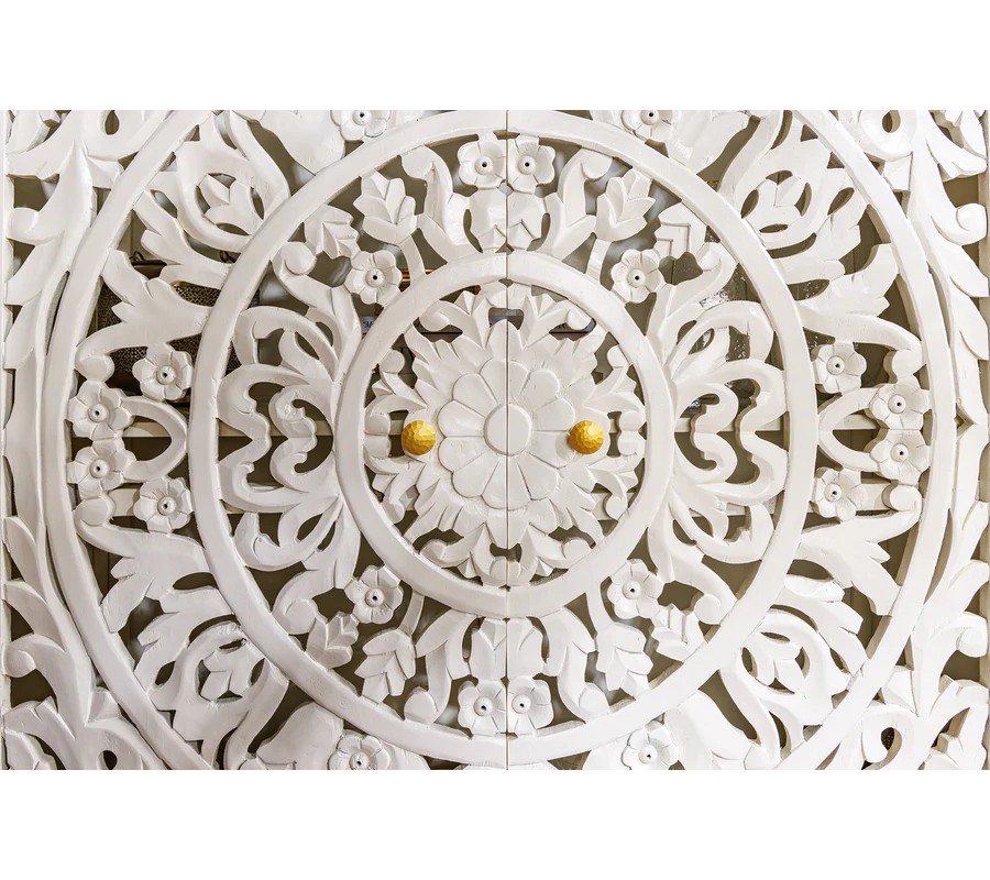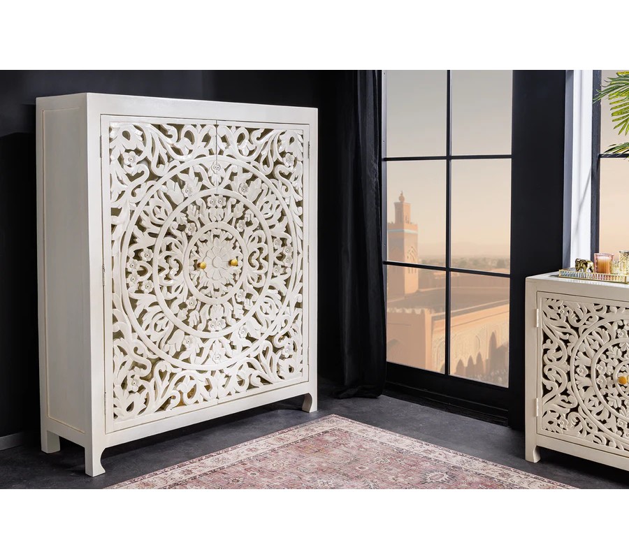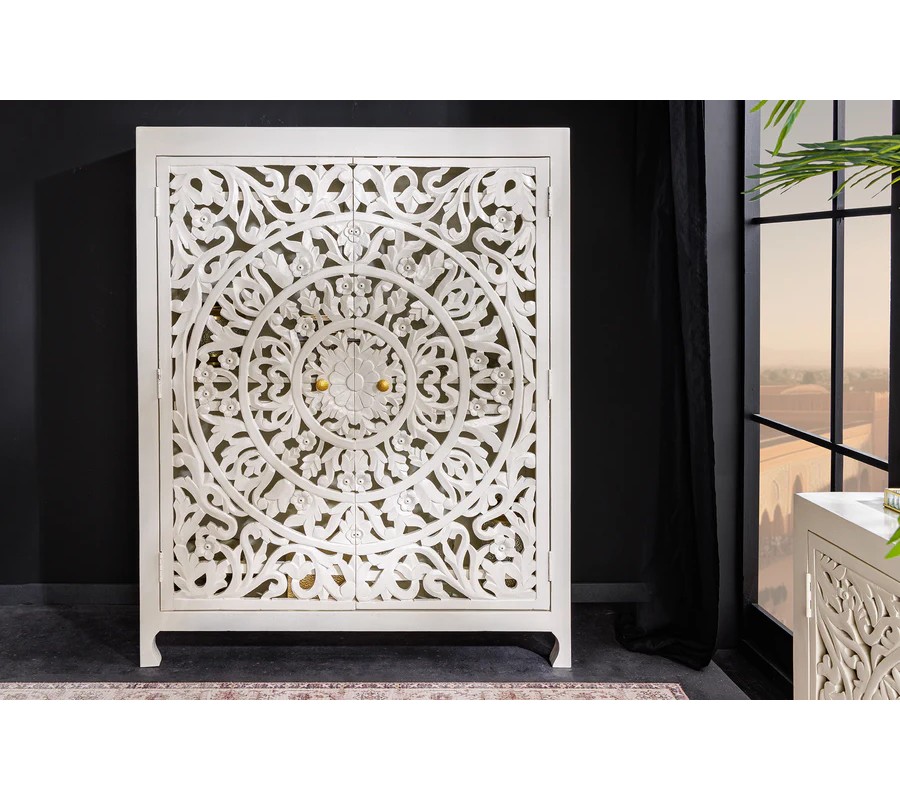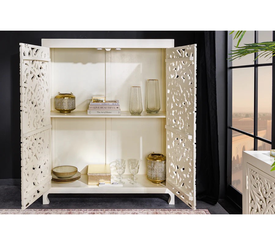 Štýlovo je táto skrinka vhodná do orientálneho, boho alebo vidieckeho interiéru, kde môže slúžiť ako výrazný a funkčný doplnok. Skvele sa hodí do obývačky, jedálne alebo do predsiene, kde môže byť využitá na uskladnenie aj ako dekoratívny prvok. Kombinuje sa výborne s nábytkom v podobných svetlých odtieňoch alebo s doplnkami v zlatej farbe, ako sú vázy, svietniky či dekoratívne podnosy. Jej vyrezávané detaily oživia priestor a dodajú mu jedinečný šarm.