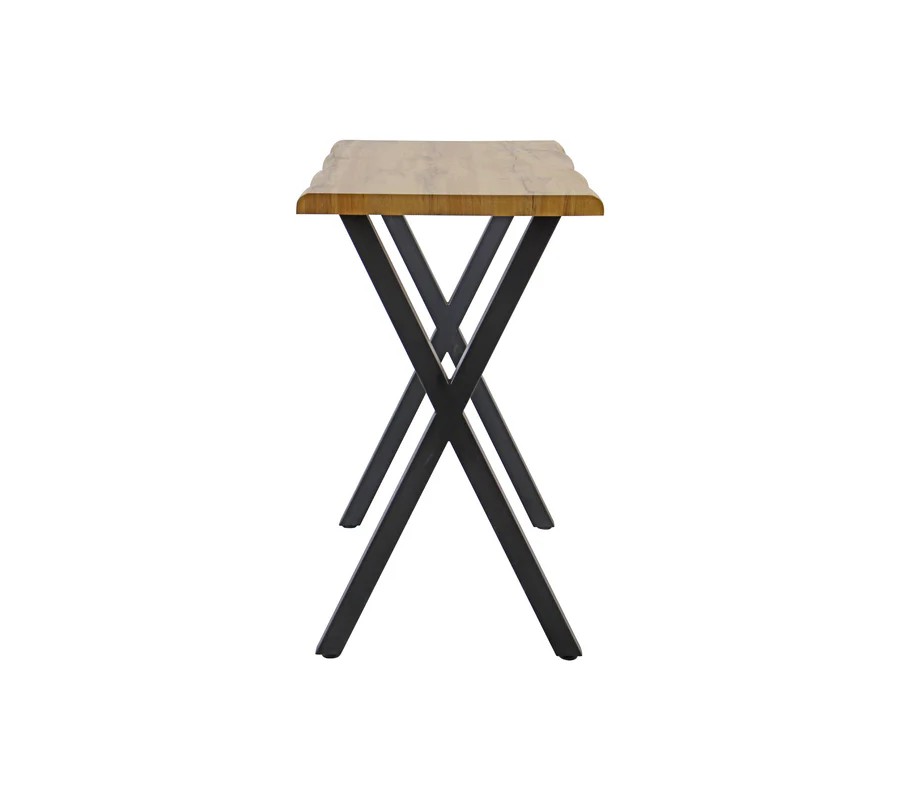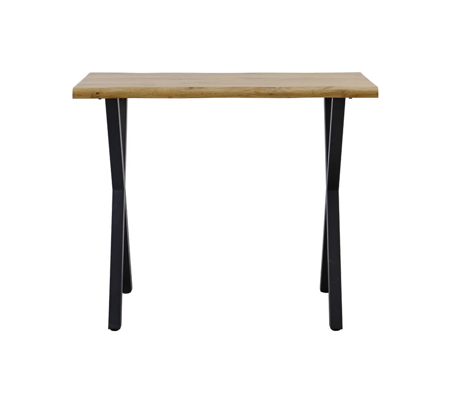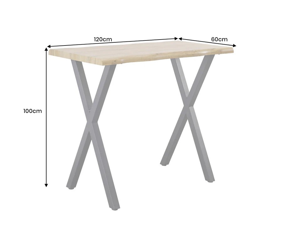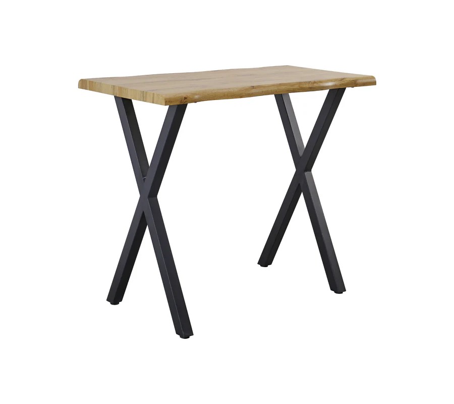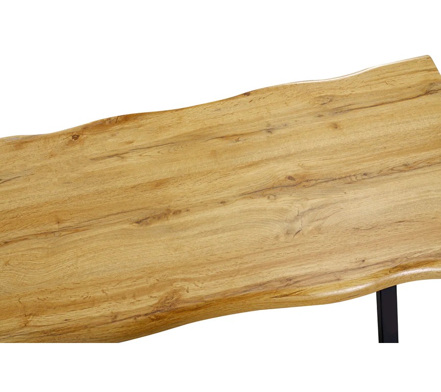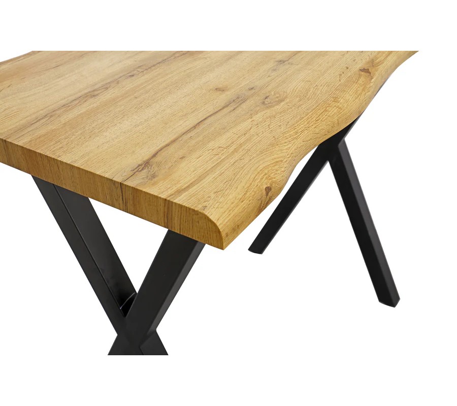 Barový stôl Wild kombinuje prírodné a industriálne prvky, čo z neho robí štýlový a funkčný doplnok moderného interiéru. Obdĺžniková doska so zvlnenými okrajmi, čo vytvára dojem autentického dreva, je vyrobená z masívneho dreva s dubovým dizajnom a svetlým prírodným hnedým odtieňom, ktorý zvýrazňuje autentickú textúru dreva. Povrch dosky je hladký a príjemný na dotyk, pričom jej jemne zaoblené rohy dodávajú stolu elegantný vzhľad. Stabilné nožičky v tvare písmena X sú vyrobené z čierneho matného kovu, ktorý kontrastuje s drevenou doskou a zdôrazňuje industriálny štýl. Stôl je ideálny do moderných kuchýň, barov alebo jedální s industriálnym, rustikálnym či škandinávskym dizajnom.