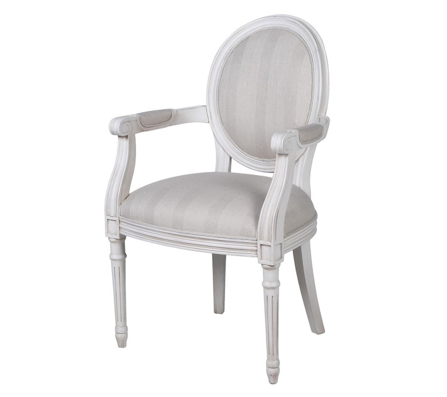 Luxusné klasické biele detské kreslo Mackly s pruhovaným čalúnením a dreveným rámom s vyrezávaným zdobením 77 cm
