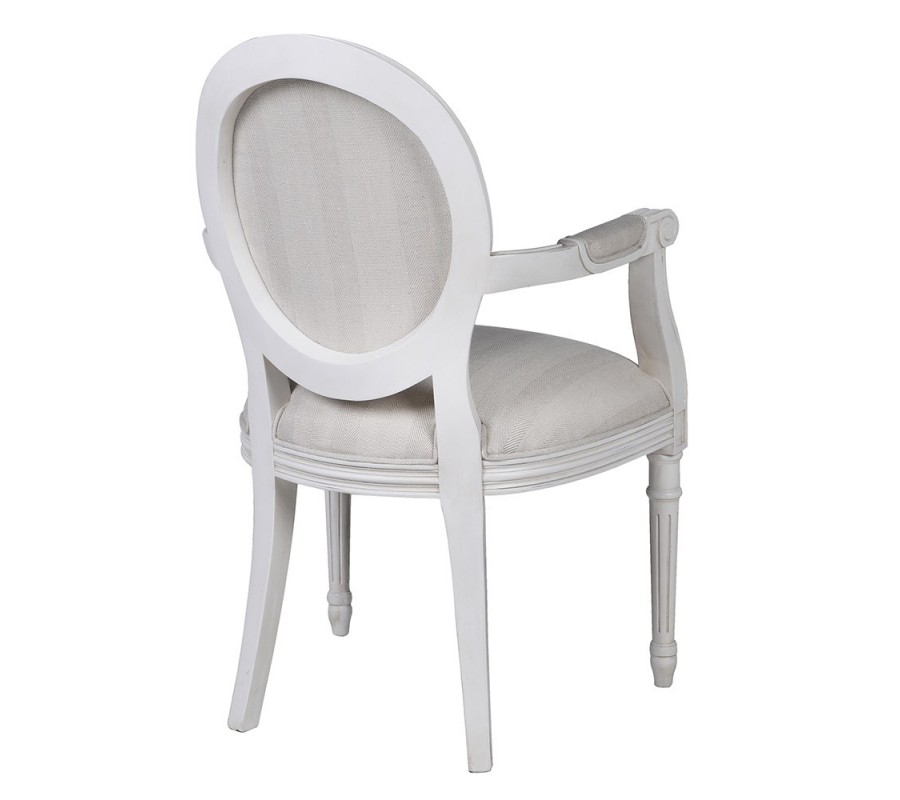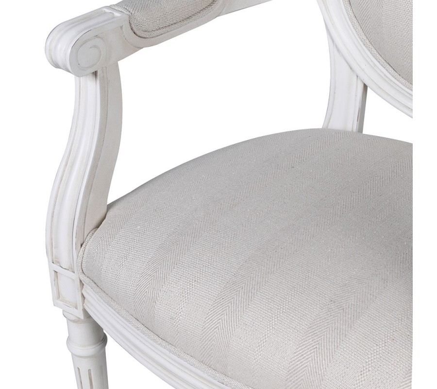 Kreslo má pevný rám vyrobený z mahagónového dreva, lakovaný v matnej bielej farbe. Predné nožičky sú valcovité a zdobí ich klasické vyrezávané zdobenie. Napájajú sa na dekoratívnu lištu pod sedadlom a odtiaľ prechádzajú do elegantnej vlnovky, napájajúcej sa na bočné opierky. Zadné nožičky sú hranaté, mierne prehnuté a ich línia sa pripája k oválnemu rámu chrbtovej opierky. Tento dizajn je inšpirovaný tradičným zámockým nábytkom.