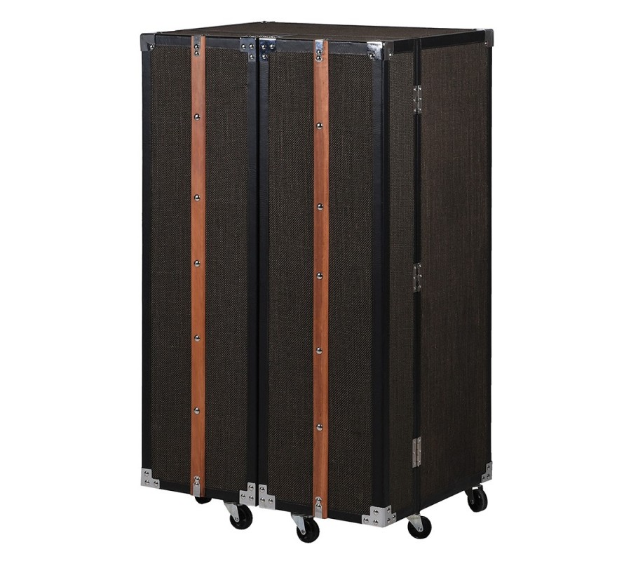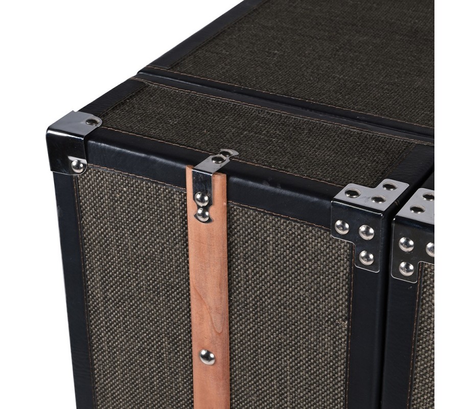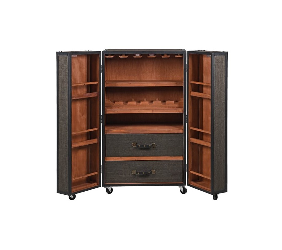 Dizajnová barová skrinka má obdĺžnikový tvar a je vyrobená v retro a vintage štýle s nádychom koloniálneho dizajnu. Stojí na kolieskach, ktoré umožňujú umožňujú jednoduchú manipuláciu. Povrch je tmavý, s textilným poťahom z konopnej látky, kombinovaný s hnedými drevenými prvkami a kovovými detailmi v striebornom odtieni, ktoré zabezpečujú jej pevnosť a zároveň pridávajú na estetike. Celkový dizajn je elegantný a praktický, vhodný do moderných i klasických interiérov.