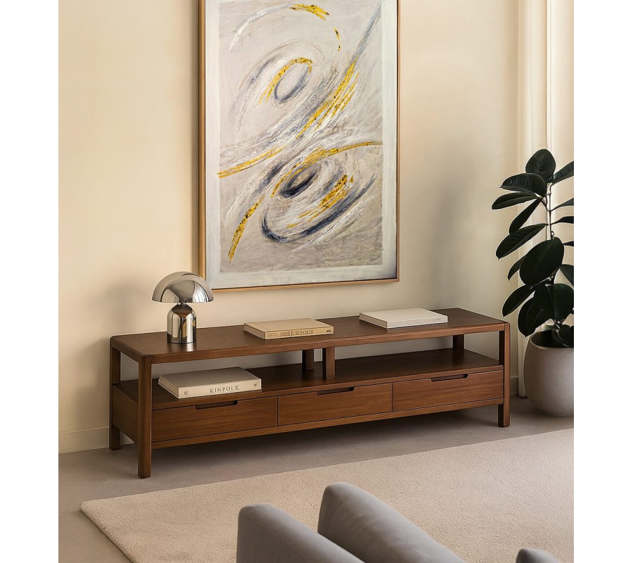 Televízny stolík má minimalistickú siluetu, v ktorej dominujú rovné línie a elegantné zakrivenia. Línia štyroch nožičiek prechádza po celej výške nábytku. Ich vonkajšia hrana je zaoblená a vnútorná zasa výrazne definovaná, čo vytvára zaujímavý dizajnový prvok. V spodnej časti sa nachádza uzavretý úložný priestor v podobe troch vedľa seba umiestnených zásuviek. Otvárajú sa pomocou obdĺžnikového výrezu vo vrchnej časti. Toto riešenie úchytiek pôsobí moderným dojmom.