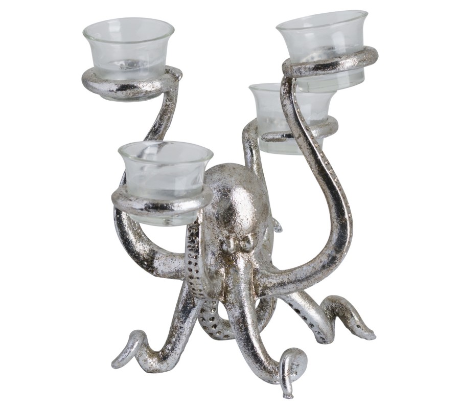 Atypický strieborný kovový svietnik pre štyri sviečky zaujme najmä svojim originálnym prevedením v tvare chobotnice, vďaka čomu bude naozaj nevšedným a štýlovým doplnkom akéhokoľvek interiéru.