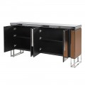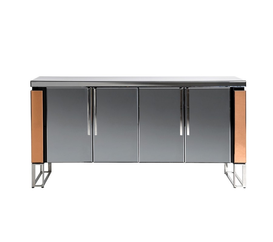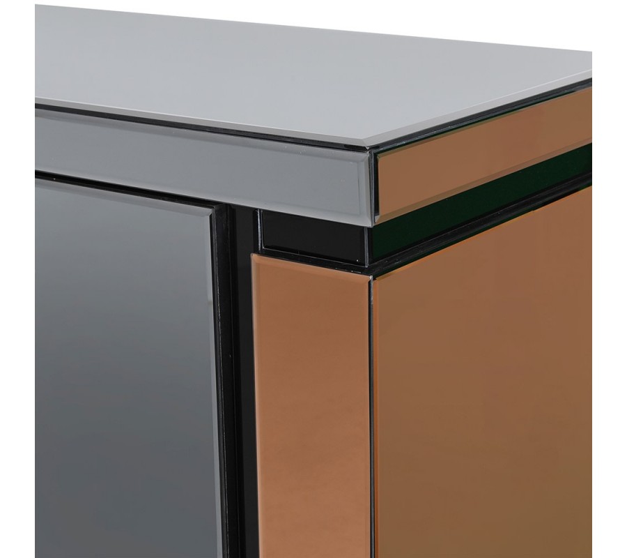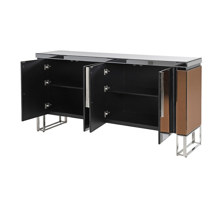 Luxusný príborník z kolekcie zrkadlového štýlového nábytku Venetia je perfektným kúskom, ktorý zaručene vynikne vo vašej jedálni. Exkluzívny vzhľad príborníka Venetia je dosiahnutý vďaka zrkadlovému sklenenému vyhotoveniu v čiernej farbe, čo je doplnené hnedými bokmi. Príborník Venetia je postavený na strieborných chromových nožičkách, ktoré krásne dopĺňajú rukoväte na štyroch praktických dvierkach. Príborník Venetia disponuje bohatým vnútorným úložným priestorom s poličkami, čo podčiarkne jeho kvalitnú praktickú stránku. Art-deco exkluzívny príborník Venetia odporúčame kombinovať v jedálňach napríklad s mramorovými jedálenskými stolmi, s lesklým nábytkom, a nábytkom z kolekcie Venetia.