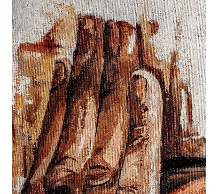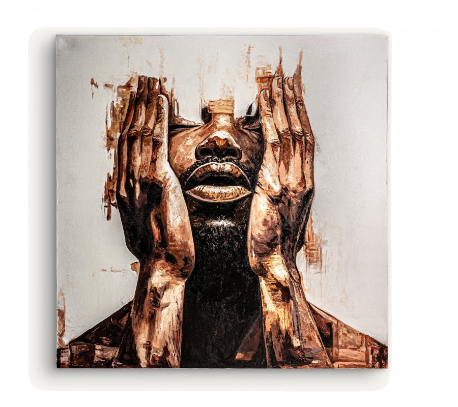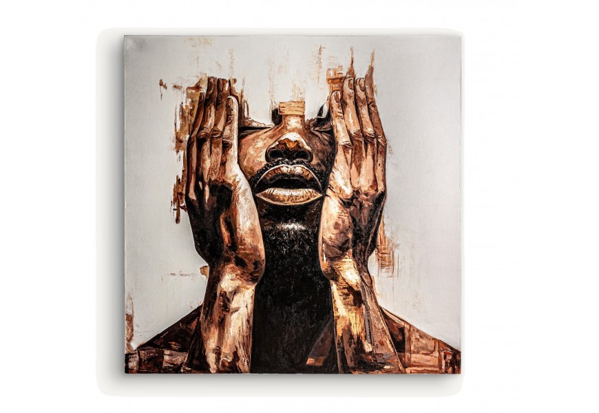 Plátno má biele pozadie a je na ňom zobrazený portrét muža s rukami priloženými k tvári. Štýl maľby je moderný s abstraktnými prvkami a kombinuje širokú škálu odtieňov hnedej farby. Dominantným prvkom diela sú práve ruky muža a oči, ktoré nie sú zobrazené, dodávajú figúre anonymný charakter.