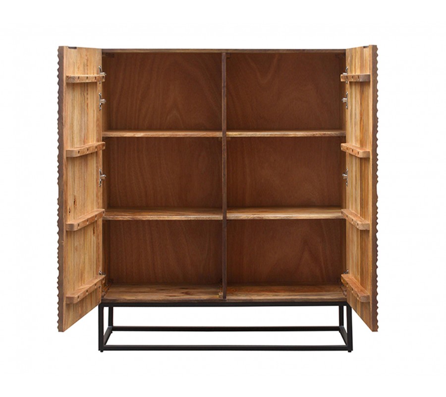 Dvojité dvierka zdobí ručne vyrezávaný reliéf. Vzor tvoria sústredné kružnice so zvlnenými líniami a vizuálne pripomína prierez kmeňa stromu s letokruhmi. Za dvierkami sa nachádza úložný priestor rozdelený sa šesť políc v troch radoch, čo umožňuje prehľadnú organizáciu barového náradia, riadu a fliaš.