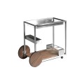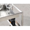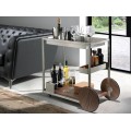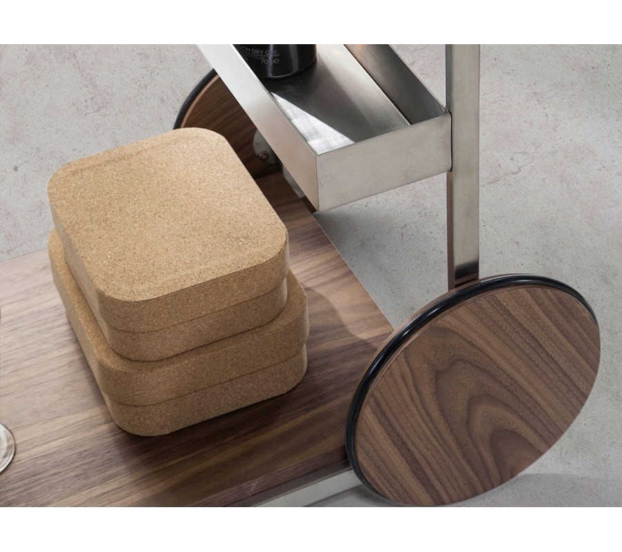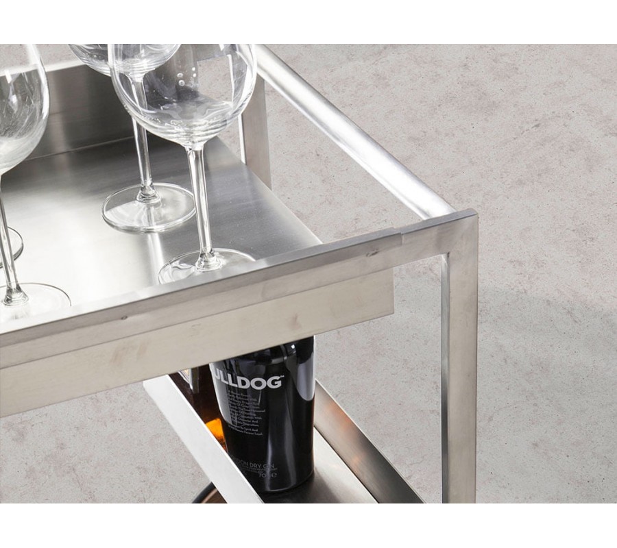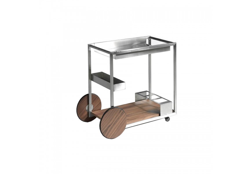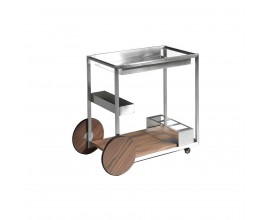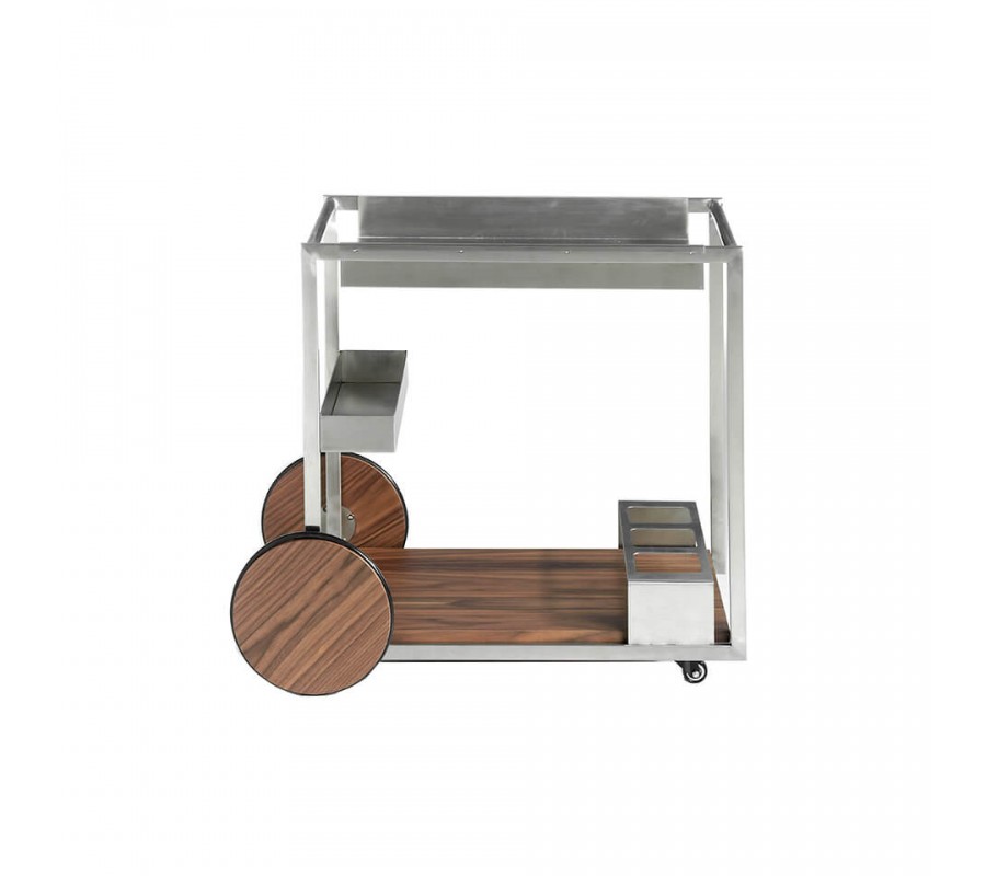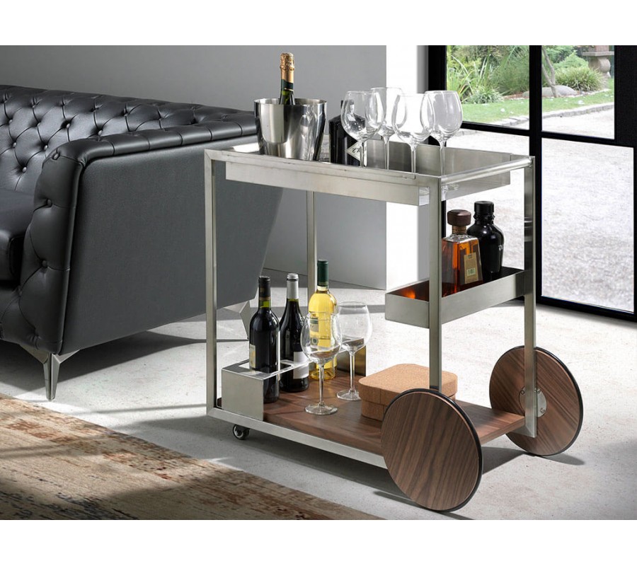 V siluete vozíka dominujú rovné línie, ktoré v kombinácii s lesklým kovovým povrchom pôsobia moderným minimalistickým dojmom. Konštrukcia je zhotovená z nehrdzavejúcej ocele s lešteným povrchom, ktorý dodáva nábytku až chrómový vizuál. Dekoratívny charakter má v kompozícii dvojica veľkých hladkých kolies a povrch spodnej police. Sú pokryté drevom v teplom orechovom hnedom odtieni, ktorý kontrastuje so zvyškom konštrukcie. Výrazná kresba letokruhov pôsobí ako naturálny vzor a dodáva hladkým povrchom vizuálnu štruktúru.