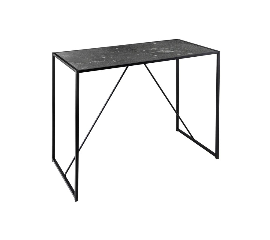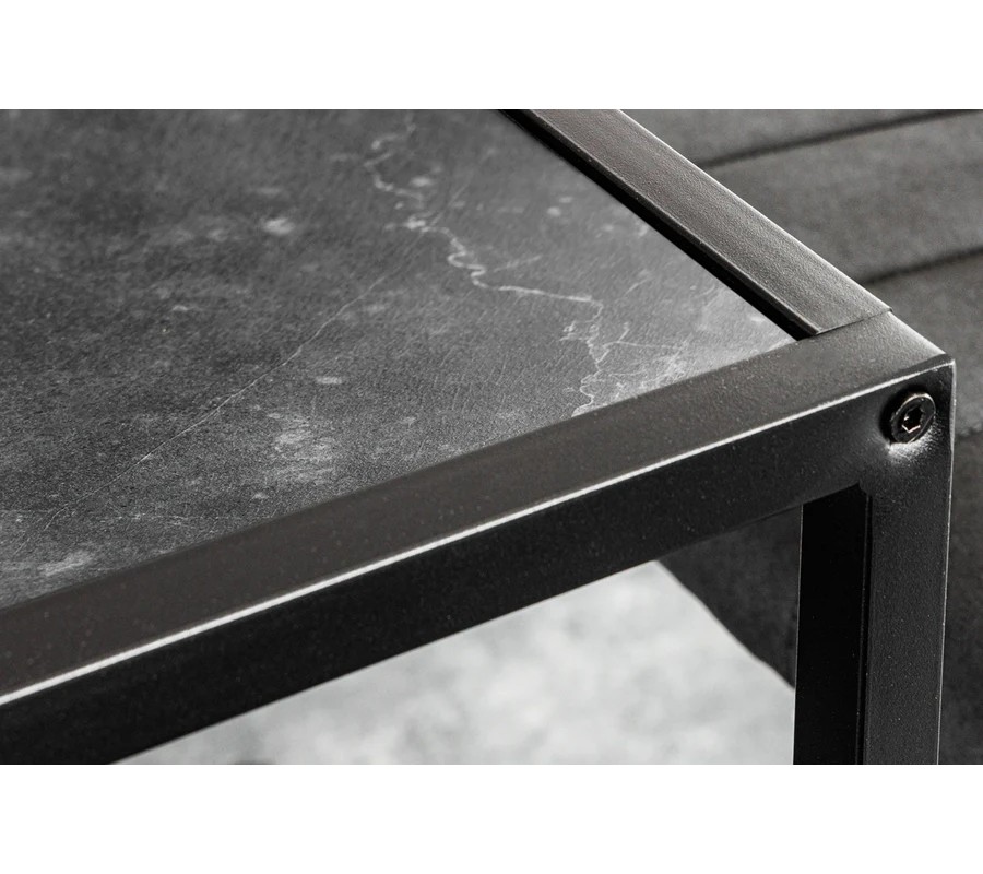 Stôl má modernú siluetu, v ktorej dominujú rovné línie. Vrchná doska má obdĺžnikový tvar a jej povrch zdobí elegantný dizajn čierneho mramoru. Jemná biela kresba vytvára subtílny dekoratívny element a prináša do inak industriálneho dizajnu nádych elegancie.