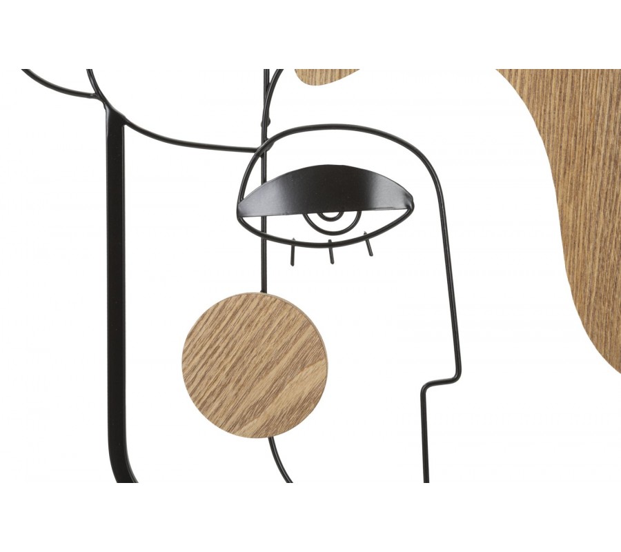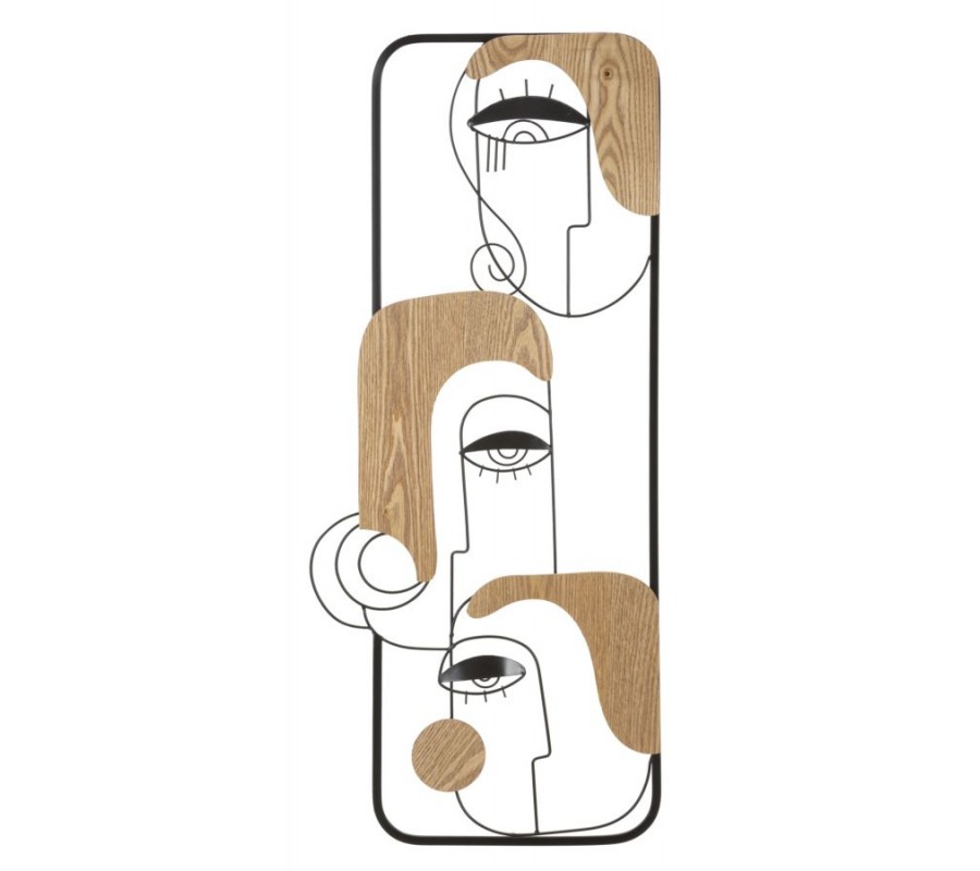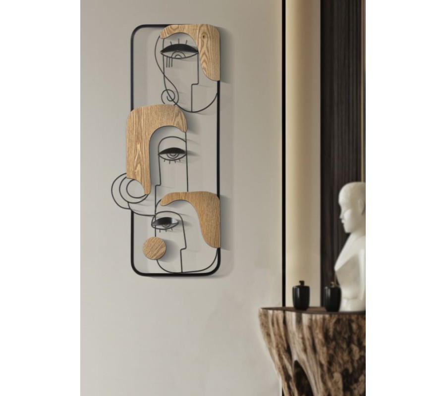 Nástenná dekorácia Donna je výnimočný umelecký doplnok s abstraktným motívom troch ženských tvárí, ktoré sú vytvorené kombináciou jemných kovových línií a drevených detailov v teplom hnedom odtieni. Táto kompozícia pripomína avantgardné umenie a vynikne v interiéroch, ktoré kladú dôraz na originalitu a moderný dizajn.