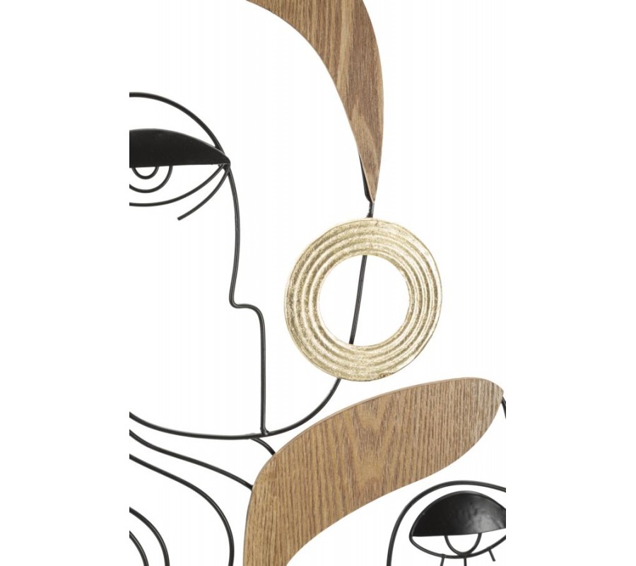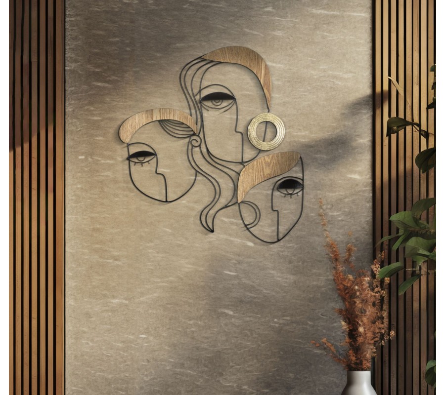 Nástenná dekorácia Donna je moderný dizajnový prvok, ktorý prináša do interiéru umeleckú atmosféru s nádychom abstrakcie. Čierne kovové línie vytvárajú tri ženské tváre, ktoré sú doplnené hnedými drevenými prvkami a zlatými detailmi, čím vzniká harmonická kompozícia materiálov a farieb.