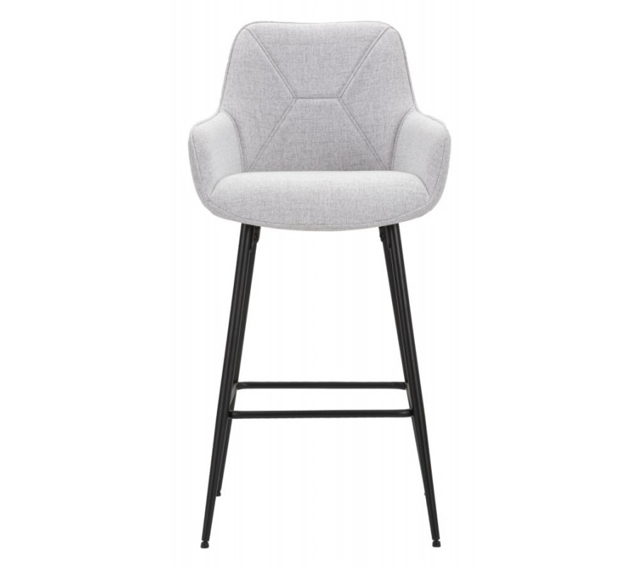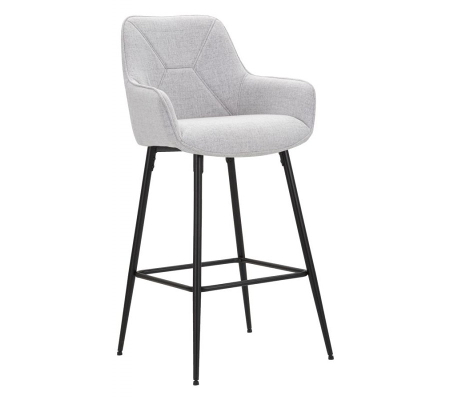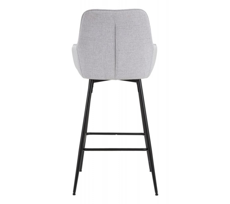 Moderná barová stolička Eli s čiernymi kovovými nožičkami a sivým látkovým čalúnením s geometrickým vzorom 109 cm