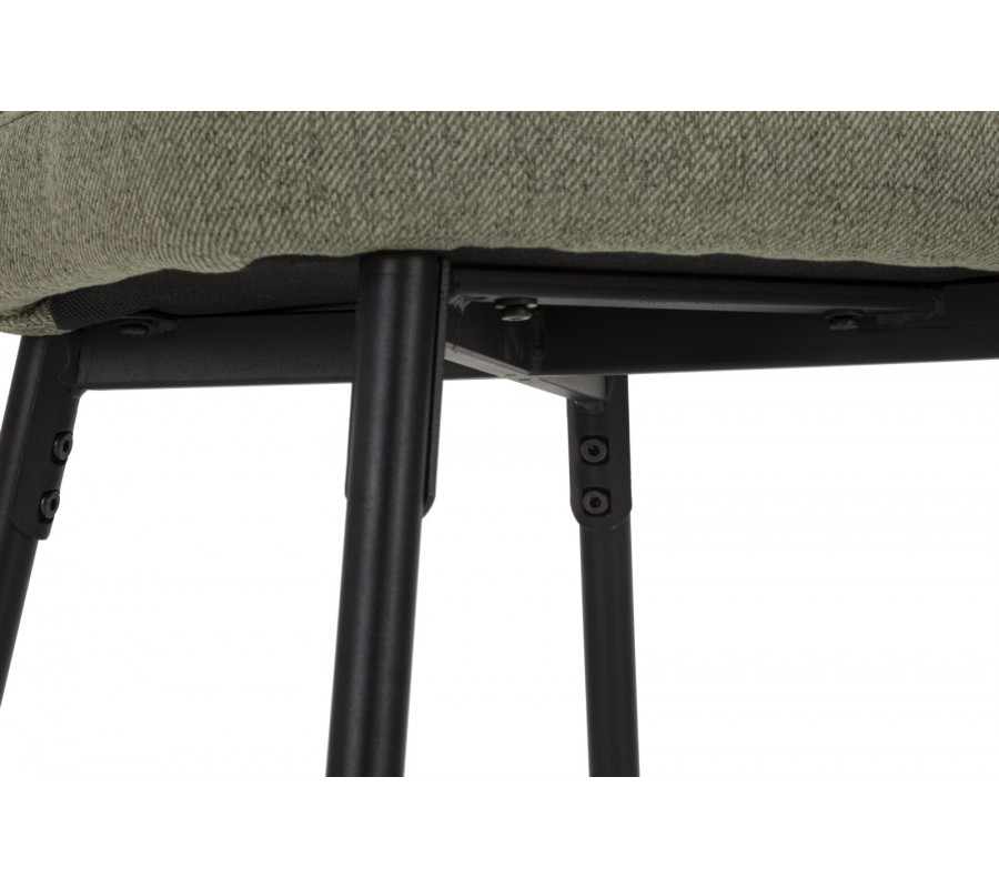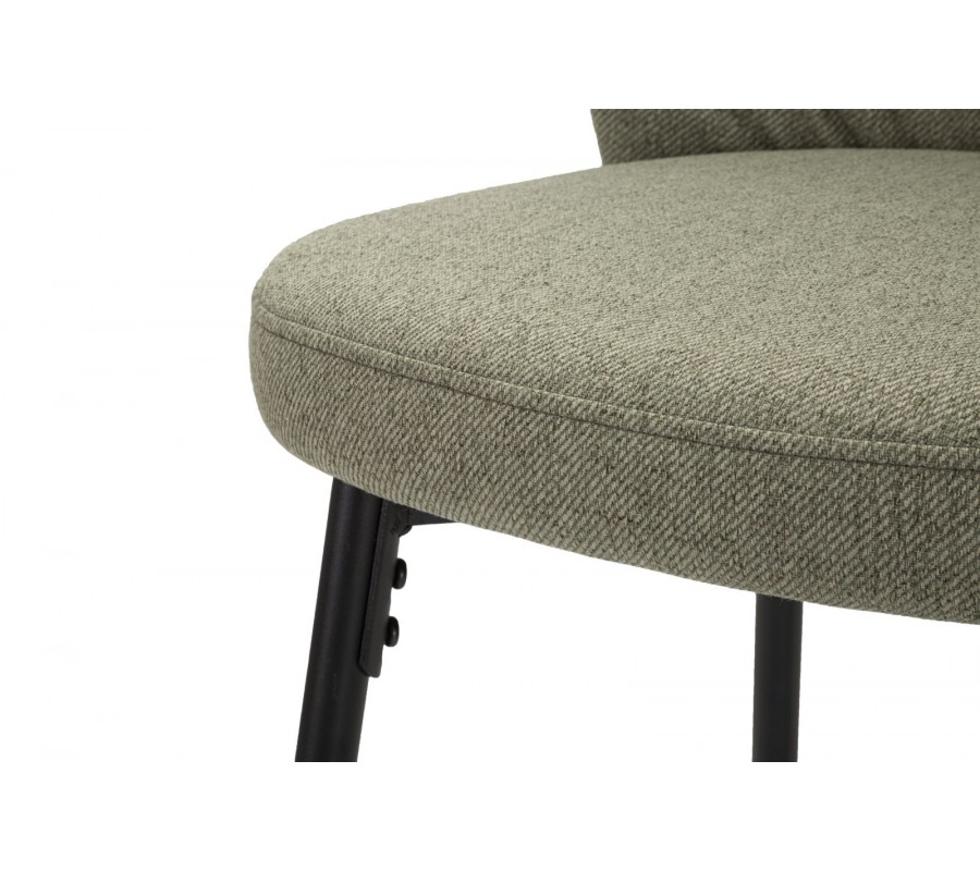 Sedacia časť je potiahnutá kvalitnou textíliou v olivovo zelenej farbe, ktorá sa vyznačuje výrazným tkaním a príjemnou štruktúrou na dotyk. Mäkké penové čalúnenie zabezpečuje pohodlie aj pri dlhšom sedení, vďaka čomu je stolička ideálna na každodenné použitie.