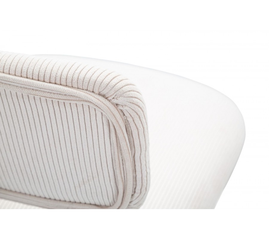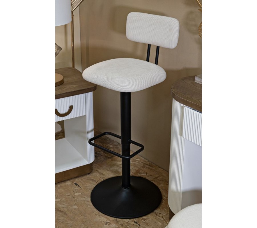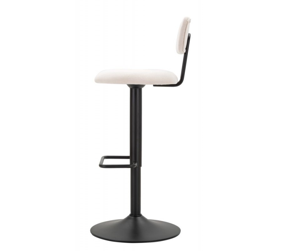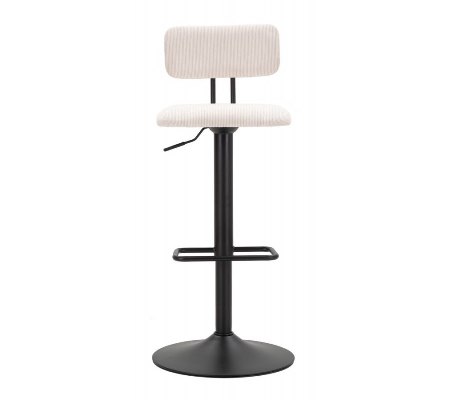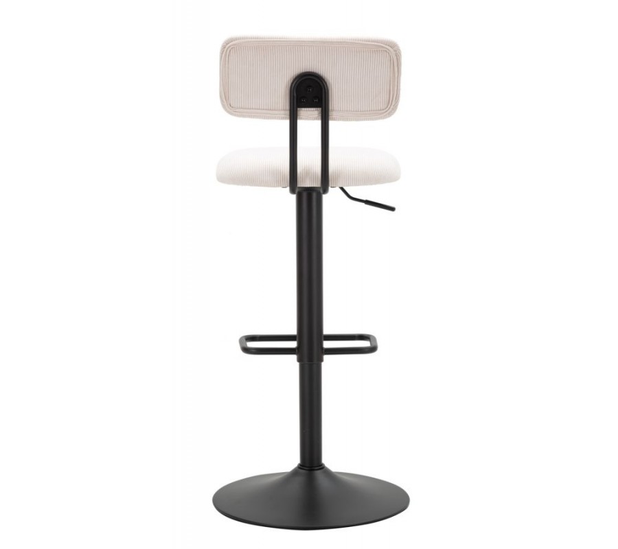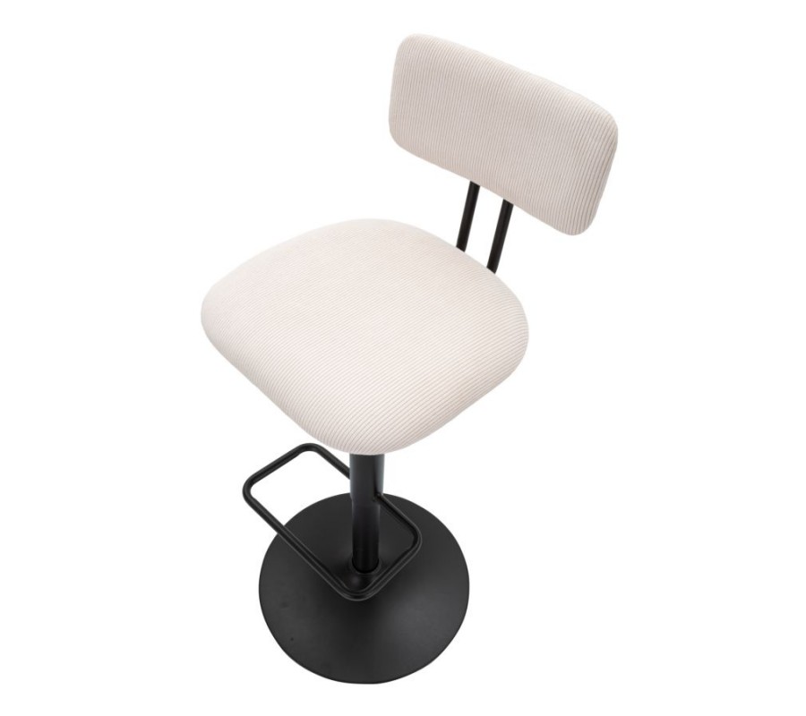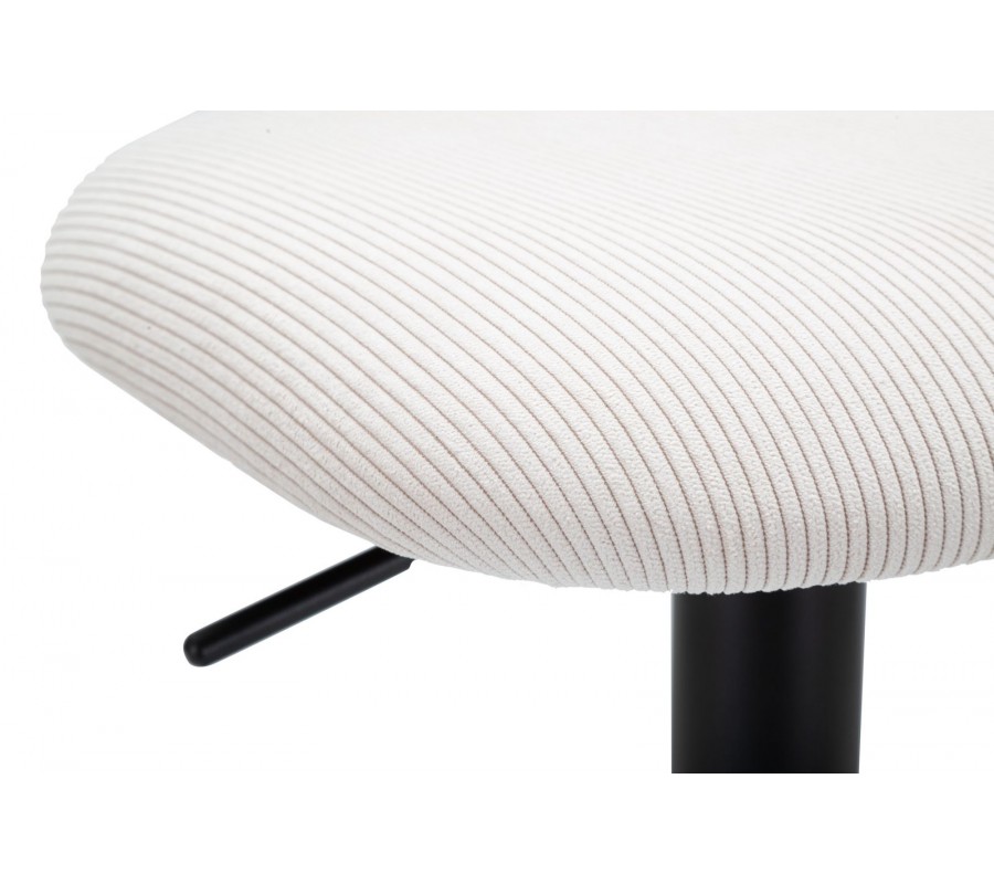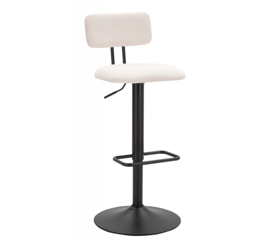 Barová stolička Nairo spája eleganciu, komfort a moderný dizajn, vďaka čomu sa stáva ideálnym doplnkom do rôznych interiérov. Okrúhle sedadlo a menšie obdĺžnikové operadlo s menčestrovým poťahom v bielej farbe vytvárajú harmonický vzhľad, ktorý pôsobí jemne a nadčasovo. Menčestrová textúra dodáva povrchu hĺbku a príjemný pocit pri dotyku, pričom zároveň zvyšuje jeho odolnosť voči každodennému používaniu.