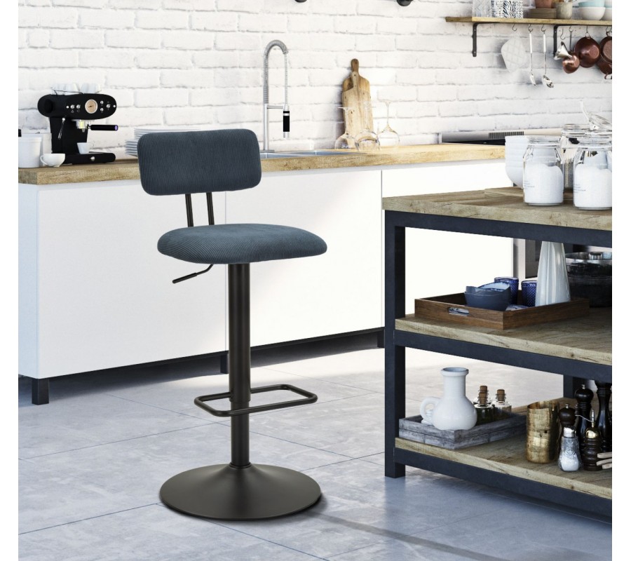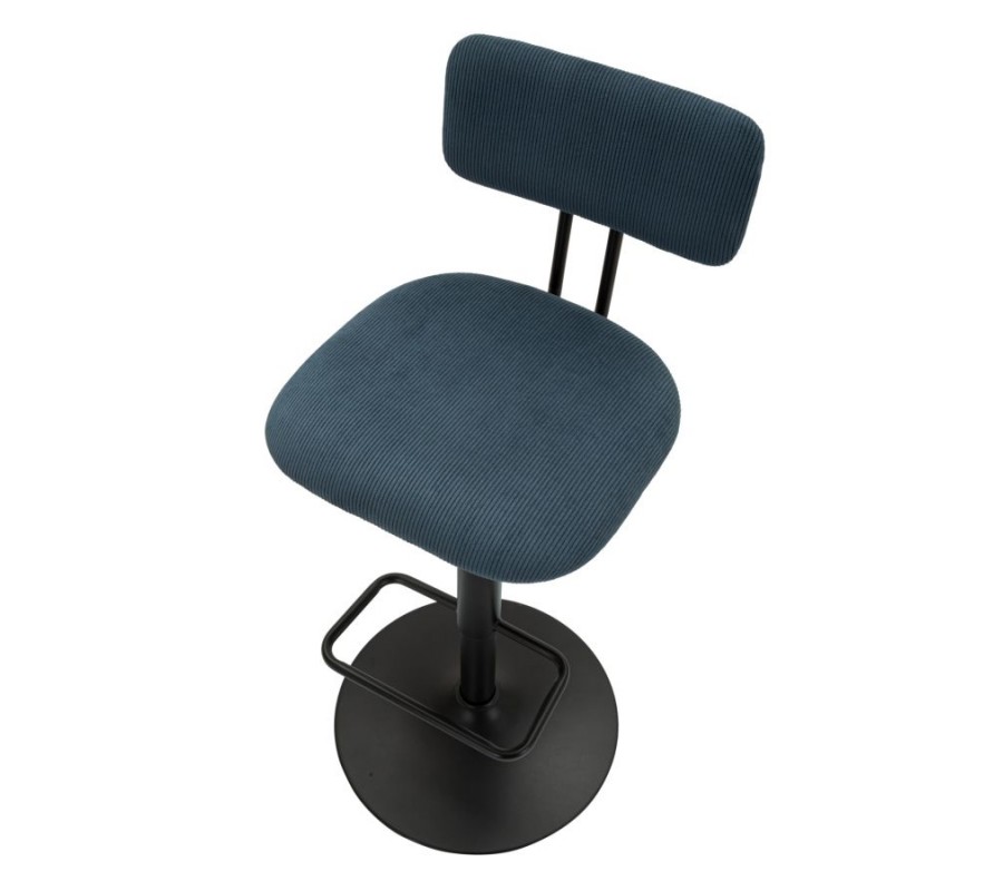 Barová stolička Nairo prináša moderný dizajn spojený s maximálnym komfortom. Sedadlo a operadlo sú potiahnuté menčestrovou látkou v tmavo modrej farbe, ktorá nielenže pôsobí vizuálne atraktívne, ale zároveň dodáva povrchu jemnú textúru a príjemný pocit pri sedení.
