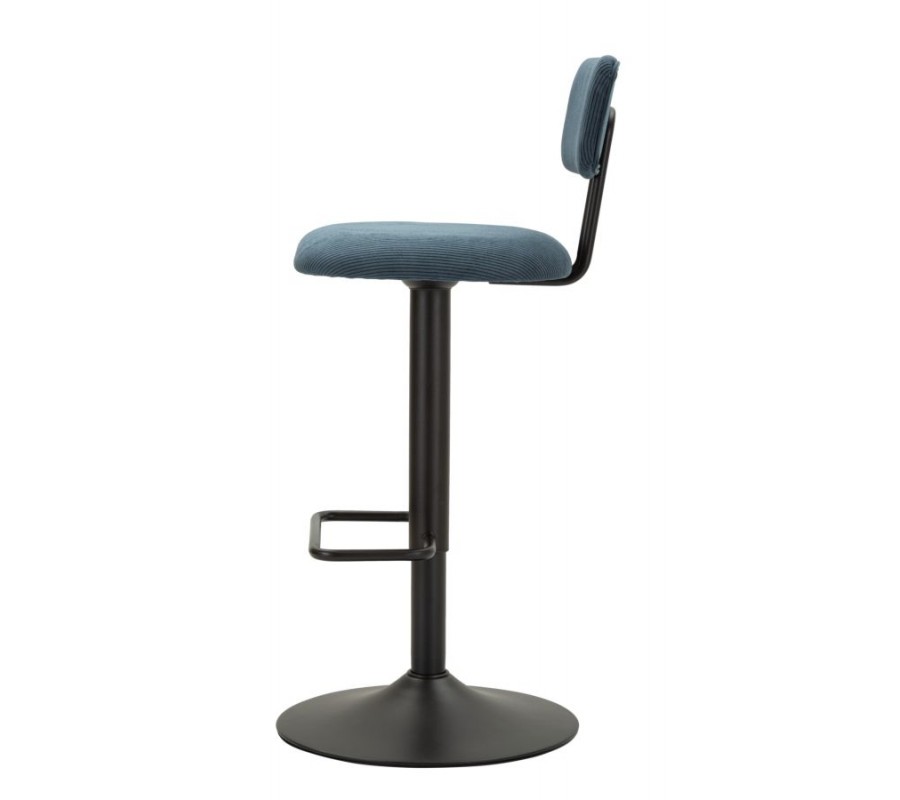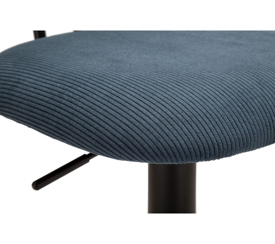 Moderná barová stolička Nairo s menčestrovým poťahom v tmavo modrej farbe a výškovo nastaviteľnou kovovou konštrukciou 106 cm
