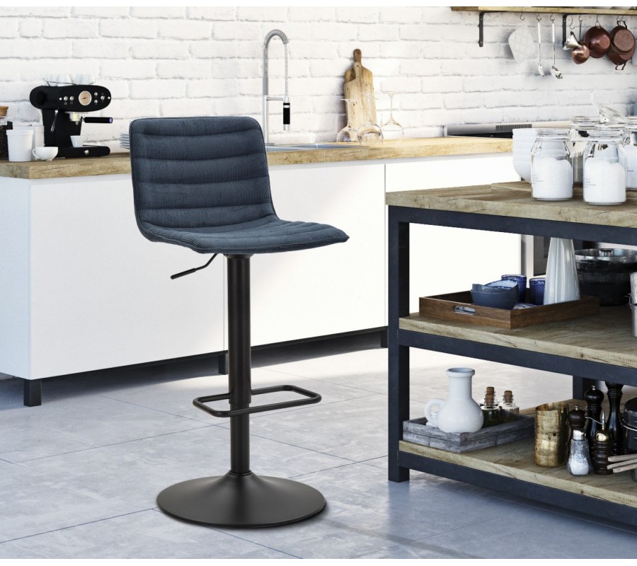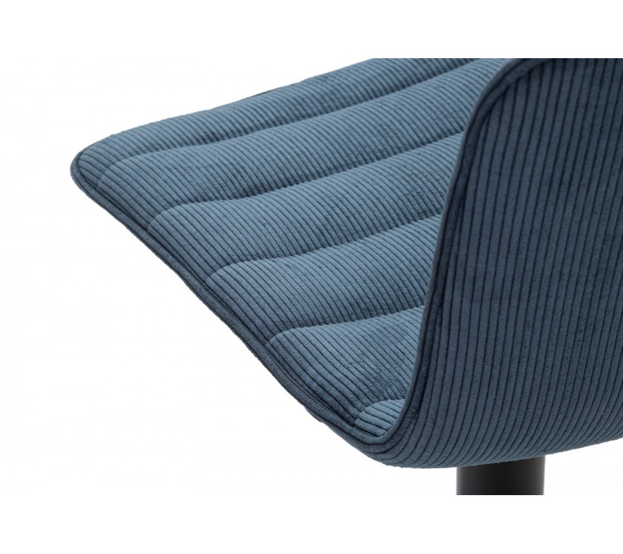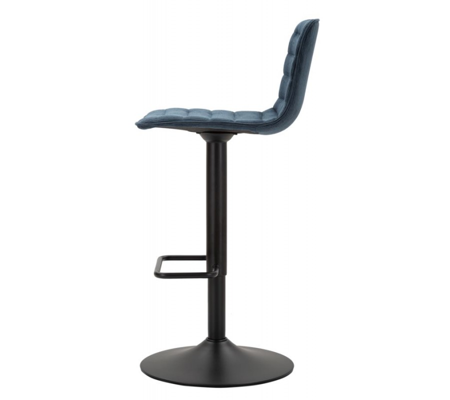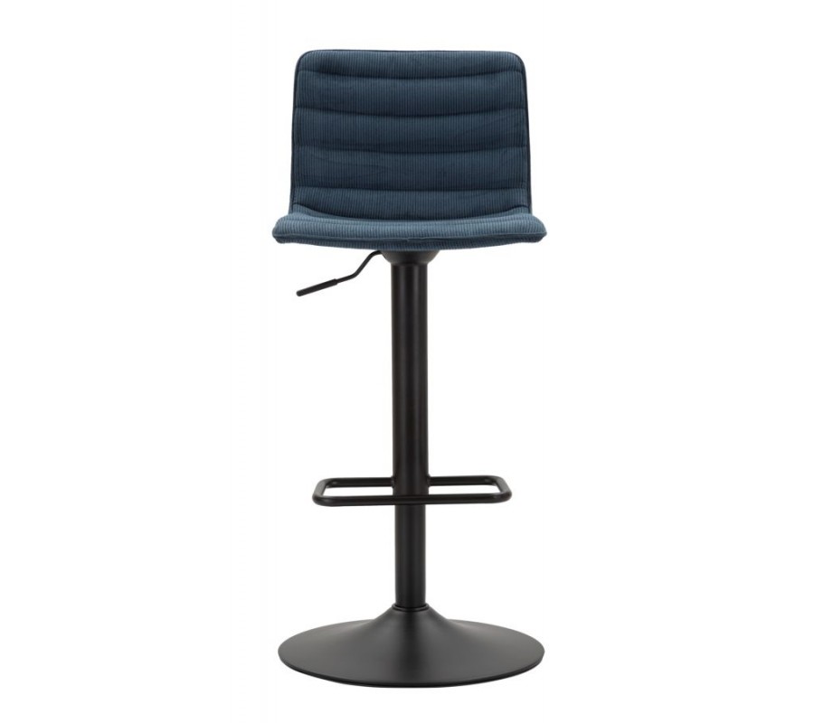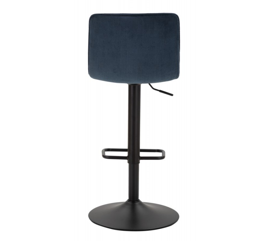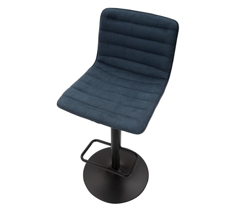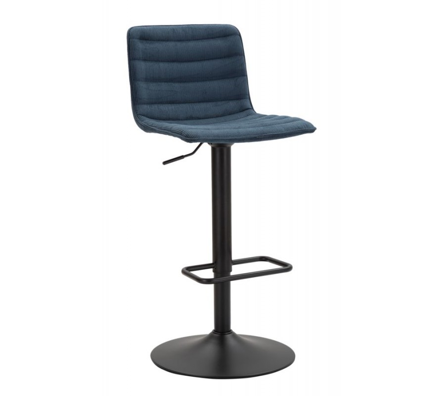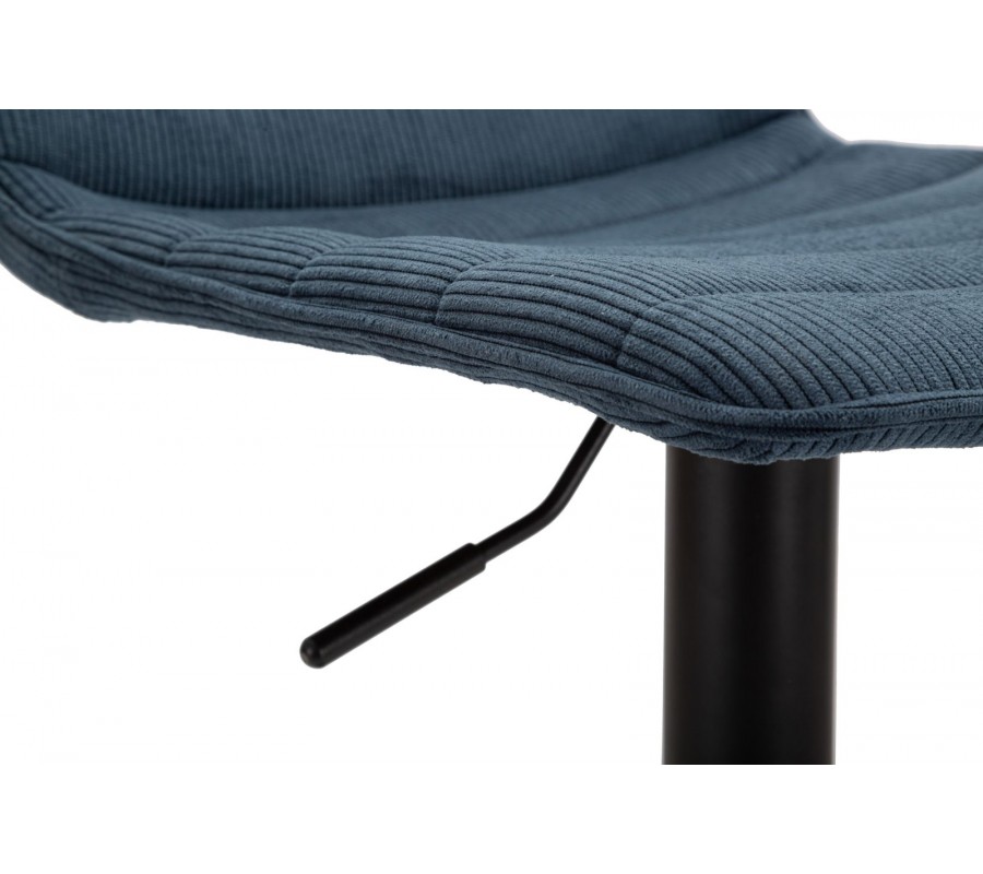 Moderná barová stolička Lenza s menčestrovým poťahom v tmavej modrej farbe a výškovo nastaviteľnou čiernou podstavou 107 cm