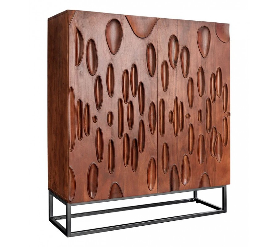 Povrch dvierok je lakovaný, čo zvýrazňuje hĺbku kresby a zároveň poskytuje praktickú ochranu pred poškodením. Skrinka stojí na čiernej kovovej podstave v obdĺžnikovom tvare, ktorá dodáva nábytku stabilitu a zároveň odľahčuje jeho mohutný vzhľad. Vo vnútri sa nachádzajú tri police, ideálne na uloženie fliaš, pohárov či barových doplnkov.