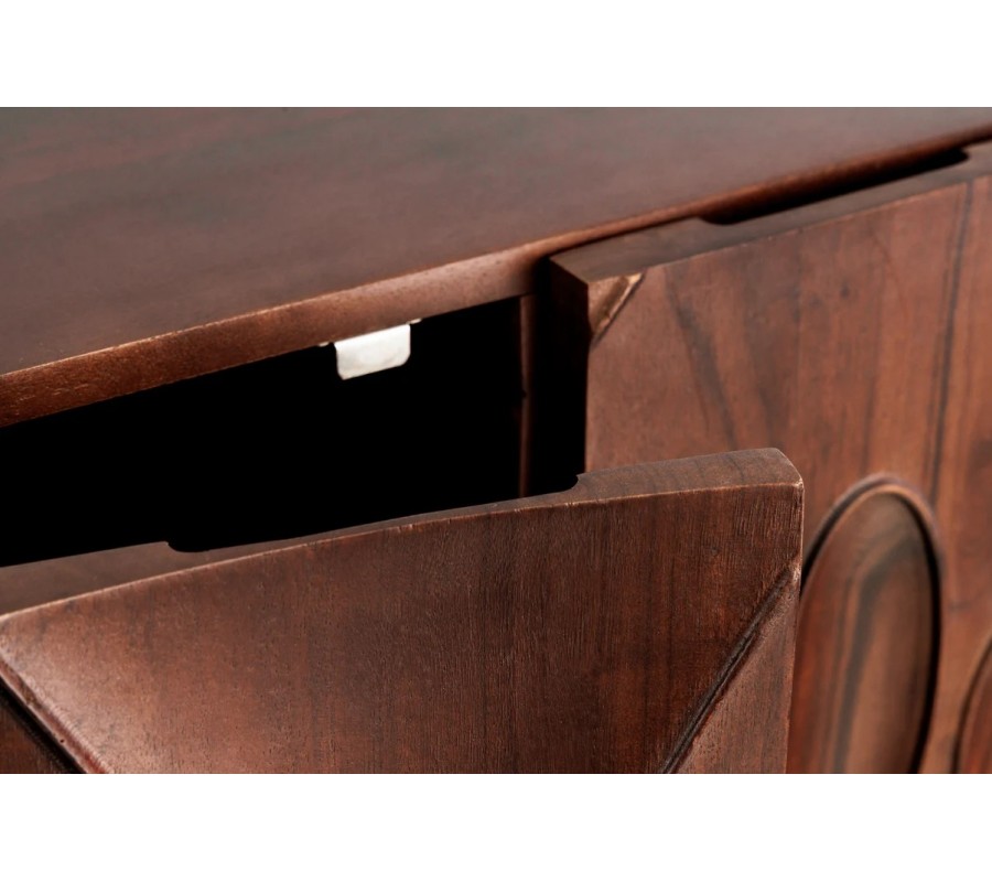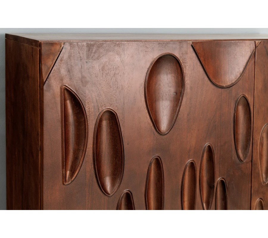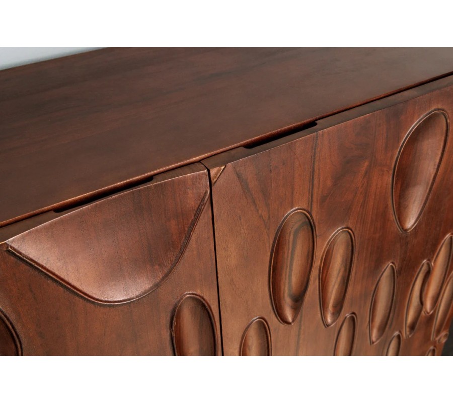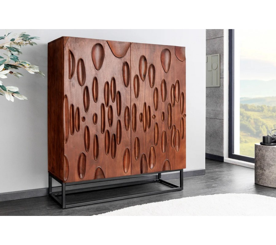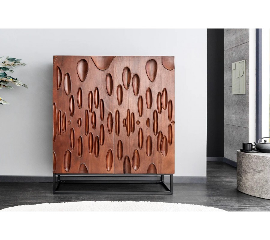 Štýlová masívna akáciová barová skrinka Wiellde je výnimočný dizajnový kúsok, ktorý prepája umelecký prístup s praktickým využitím. Jej obdĺžnikový tvar a dvojdverová konštrukcia z masívneho dreva v tmavej orechovej farbe vytvárajú harmonickú rovnováhu medzi prirodzenou eleganciou a modernou robustnosťou. Predné čelá dvierok sú pokryté výraznou vyrezávanou štruktúrou, ktorá pozostáva z oválnych a kvapkovitých prehĺbenín rôznych veľkostí a smerov – ich abstraktná forma môže pripomínať kvapky dažďa, organické stopy alebo rozmývané zrno dreva. Tento detail dodáva skrinke plastickosť a charakter, ktorý vynikne najmä v priestore s dobrým osvetlením.