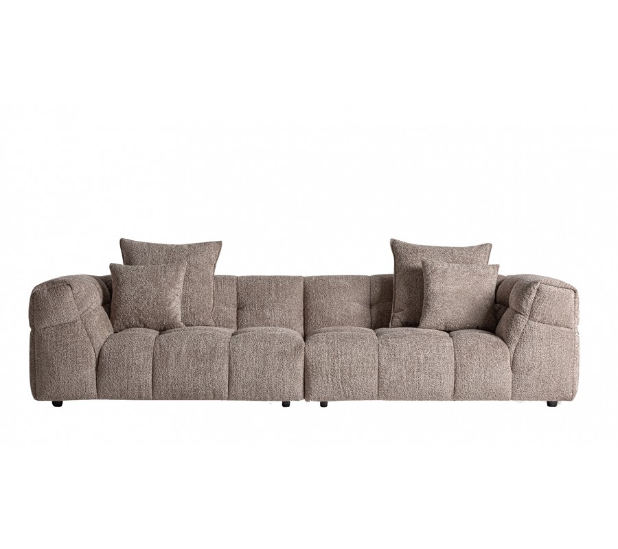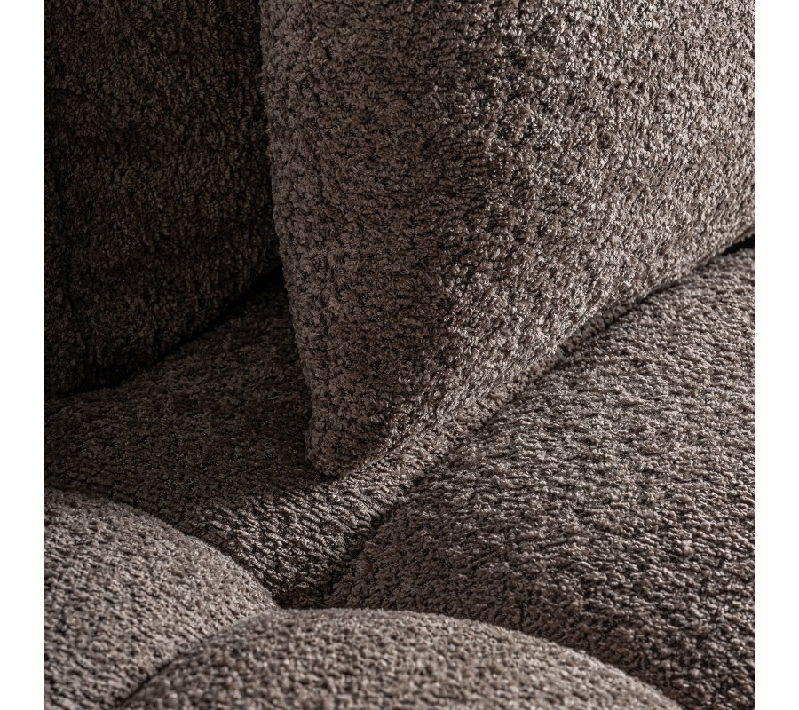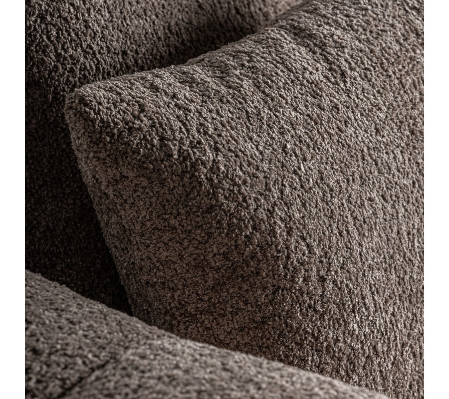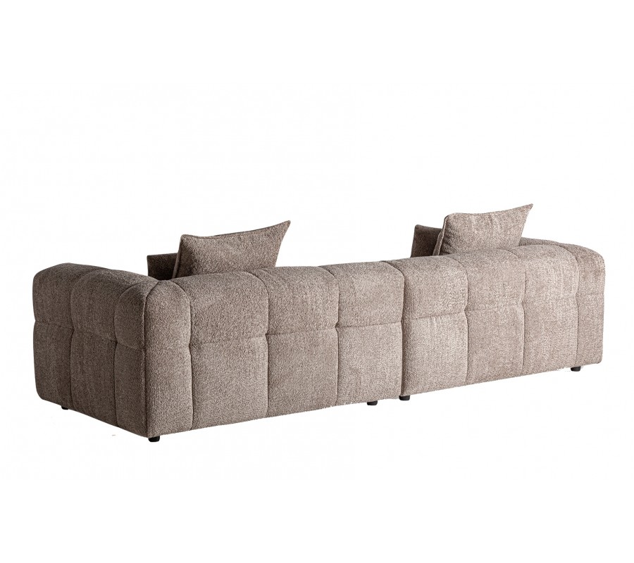 Rám pokrýva penové čalúnenie a poťah z mikrovlákna, ktoré zaručuje výbornú odolnosť voči vplyvom každodenného používania. Textília má výraznú plyšovú štruktúru, ktorá je mäkká a príjemná na dotyk. Svetlá hnedá farba so sivými podtónmi pôsobí elegantným dojmom a dodáva nábytku výraz tichého luxusu. V rovnakom poťahovom prevedení sú vyrobené aj štyri vankúše - dva menšie a dva väčšie - s výplňou z husieho peria.