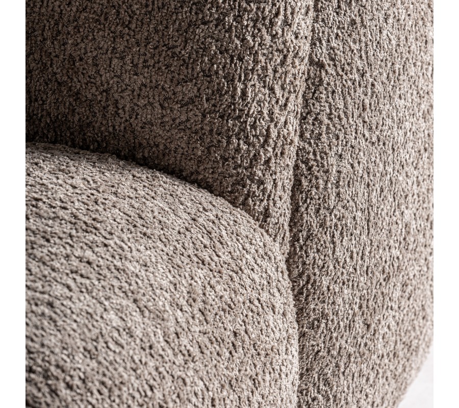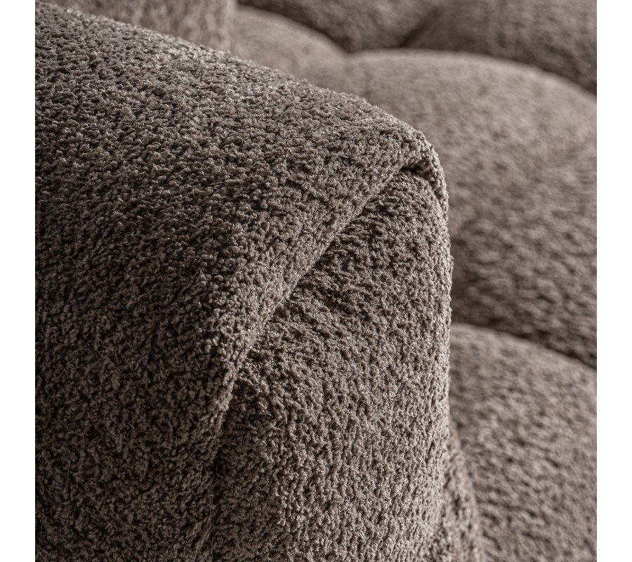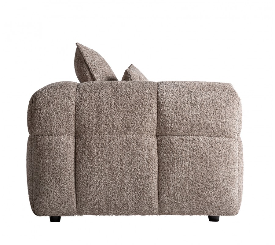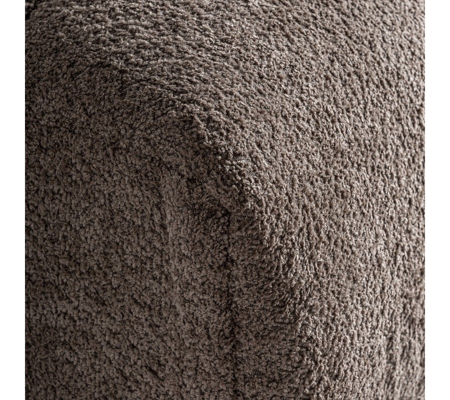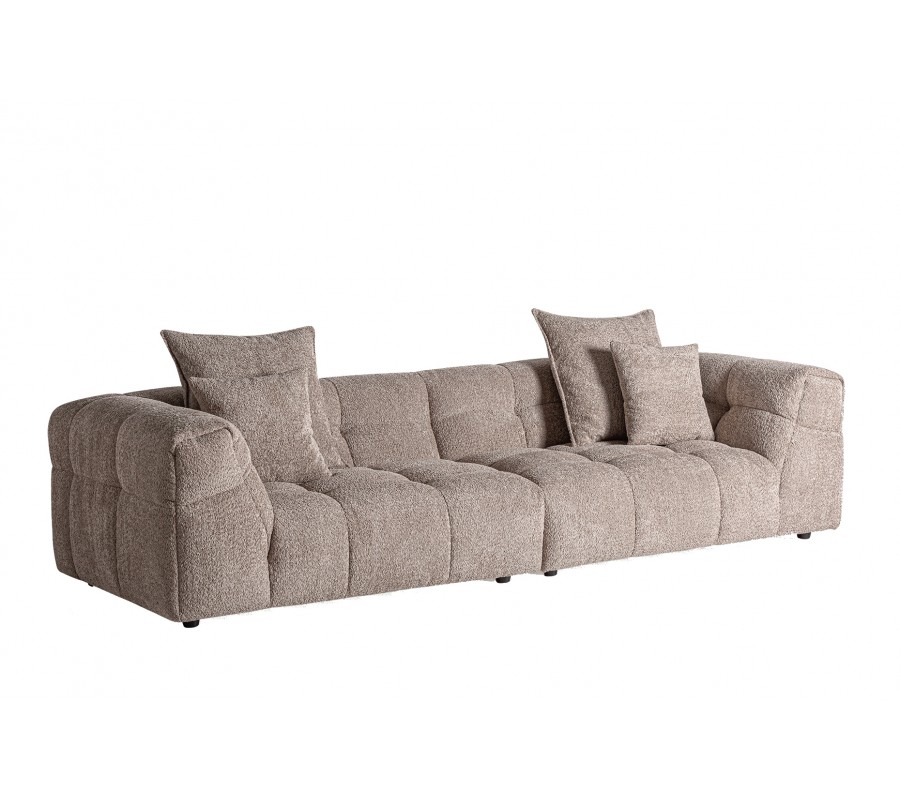Rám pokrýva penové čalúnenie a poťah z mikrovlákna, ktoré zaručuje výbornú odolnosť voči vplyvom každodenného používania. Textília má výraznú plyšovú štruktúru, ktorá je mäkká a príjemná na dotyk. Svetlá hnedá farba so sivými podtónmi pôsobí elegantným dojmom a dodáva nábytku výraz tichého luxusu. V rovnakom poťahovom prevedení sú vyrobené aj štyri vankúše - dva menšie a dva väčšie - s výplňou z husieho peria.