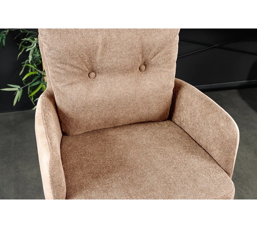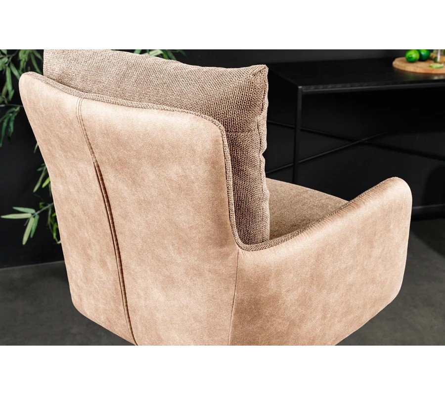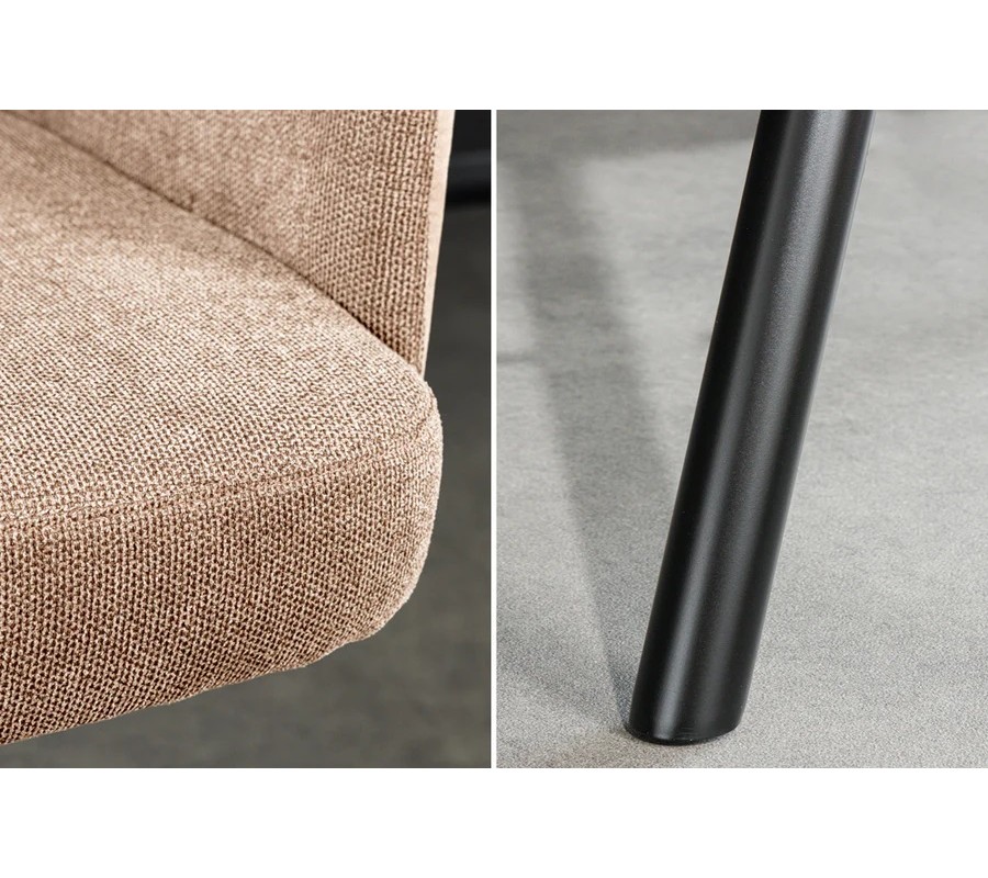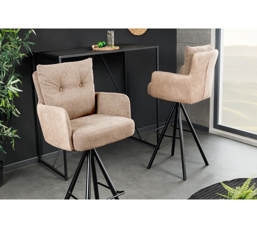 Barová stolička Dover v industriálnom štýle ponúka vyvážené spojenie komfortu, funkčnosti a moderného dizajnu. Vnútorné časti sedadla, bočných opierok a operadla chrbta sú potiahnuté jemnou textilnou látkou v odtieni šampanskej béžovej, s viditeľným tkaním, ktoré vytvára hrejivý a prirodzene útulný dojem. Vonkajšie plochy, teda zadná časť operadla a boky, sú čalúnené hladkým zamatom v rovnakom odtieni, čo stoličke dodáva vizuálnu hĺbku a elegantný kontrast.