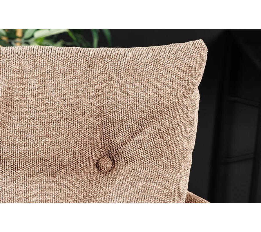Zadná opierka plynule nadväzuje na bočné opierky, čím vzniká kompaktný a pohodlný celok. Na čelnej strane operadla je výrazný mäkký obdĺžnikový vankúš s dvoma dekoračnými gombíkmi, ktoré podčiarkujú retro akcent a zároveň podporujú oporu chrbta. Zo zadnej strany operadla sa nachádza zips, ktorý plní dekoratívnu funkciu a zvýrazňuje remeselný detail.