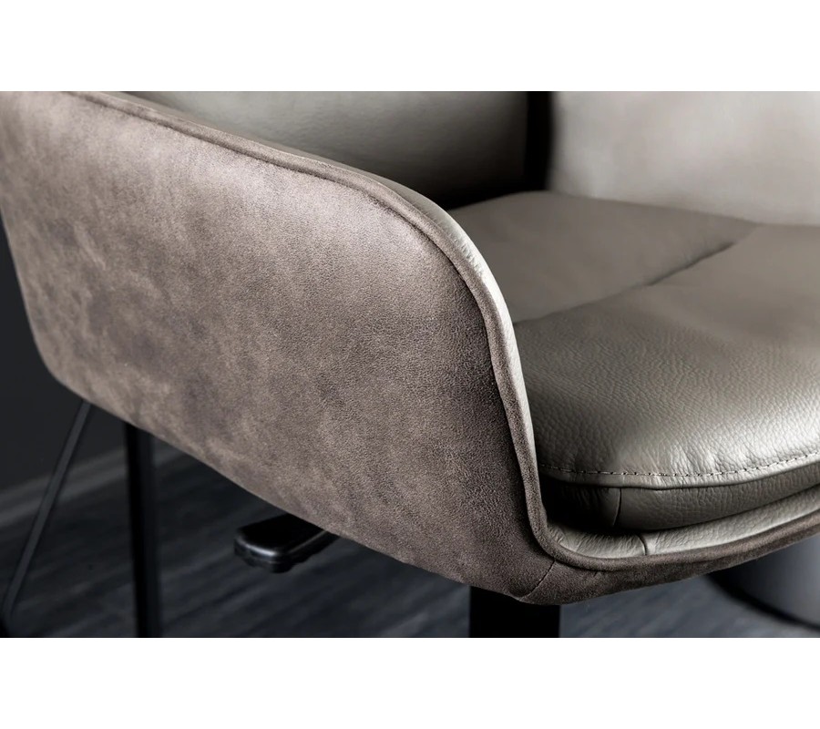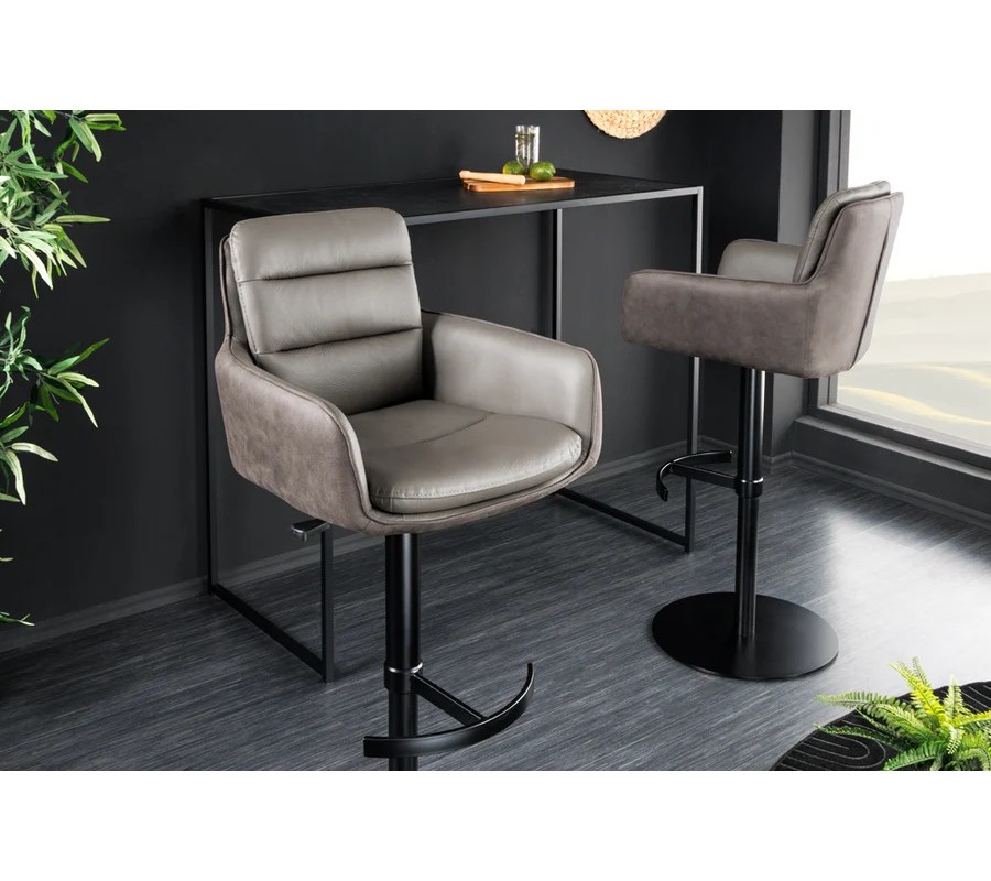 Barová stolička Dover kombinuje elegantný industriálny štýl s vysokou funkčnosťou a komfortom. Vďaka kvalitnému spracovaniu a premyslenému dizajnu sa stáva skvelou voľbou pre moderné interiéry. Vnútorné plochy sedadla, bočných opierok a operadla sú potiahnuté sivou kožou s jemným leskom. Na dotyk príjemný povrch dopĺňajú vodorovné prešívané línie, ktoré zvýrazňujú vložené vankúšové segmenty sedadla a operadla.
