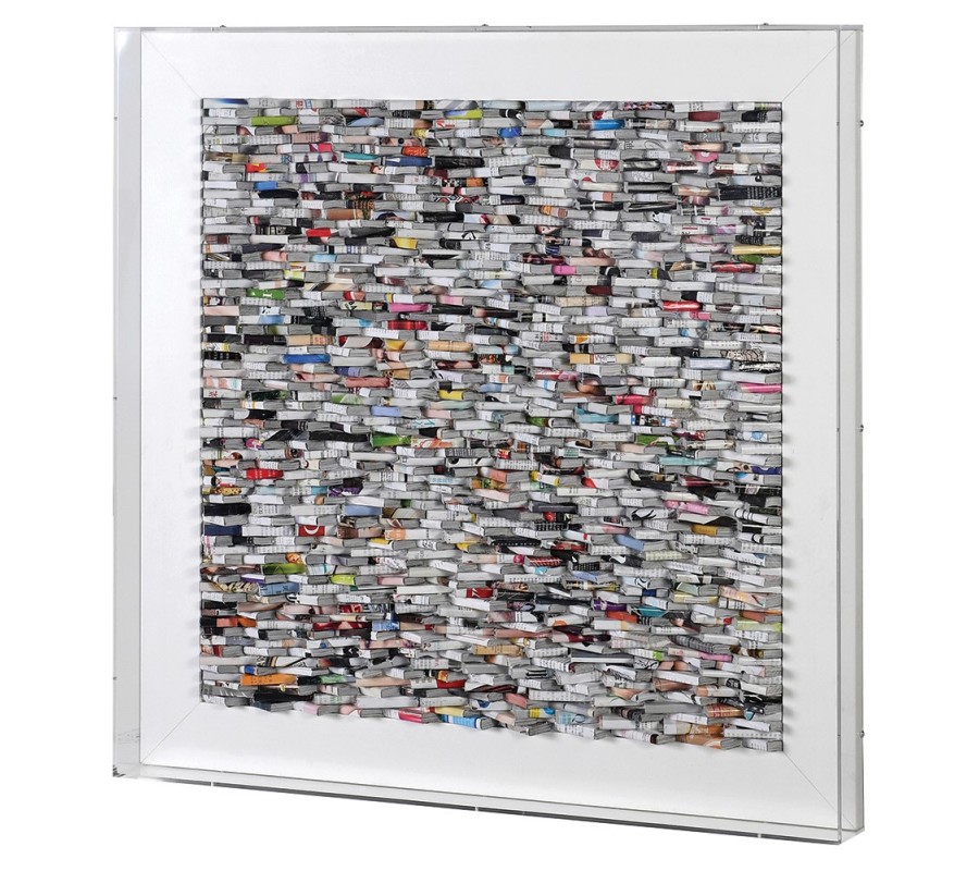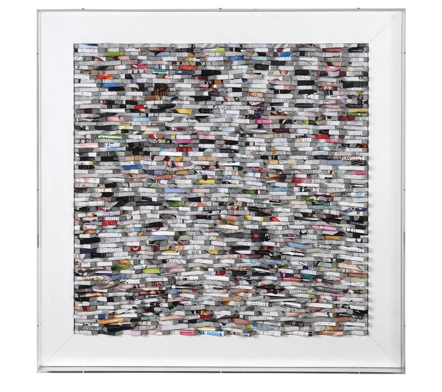 Dekorácia pozostáva z jednoduchého lesklého chrómového rámu, v ktorom je natiahnuté biele plátno. V strede sa nachádza veľký štvorcový výrez, ktorý vypĺňajú stohy kníh. Veľká pozornosť k detailom dodáva tomuto dielu naozaj unikátny rozmer. Každá knižná miniatúra má vlastnú farebnú obálku a detail stránok na bočnej strane. Knihy sú umiestnené v radoch, striedavo v lineárnej alebo diagonálnej orientácii. Rohy vyčnievajúce do priestoru vytvárajú bohatý dynamický vizuál a pravidelné opakovanie zároveň pôsobí rytmickým a harmonickým dojmom. Kompozícia je tak moderne geometrická a zároveň unikátna v každom detaile.
