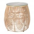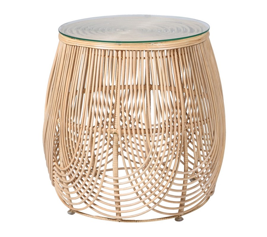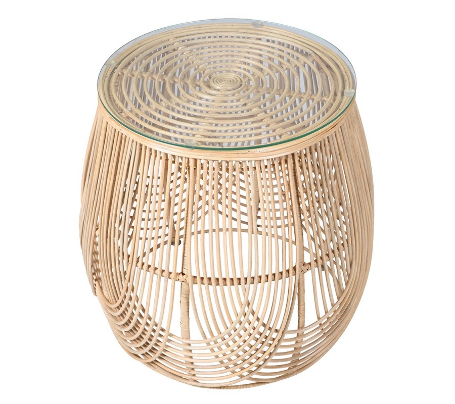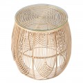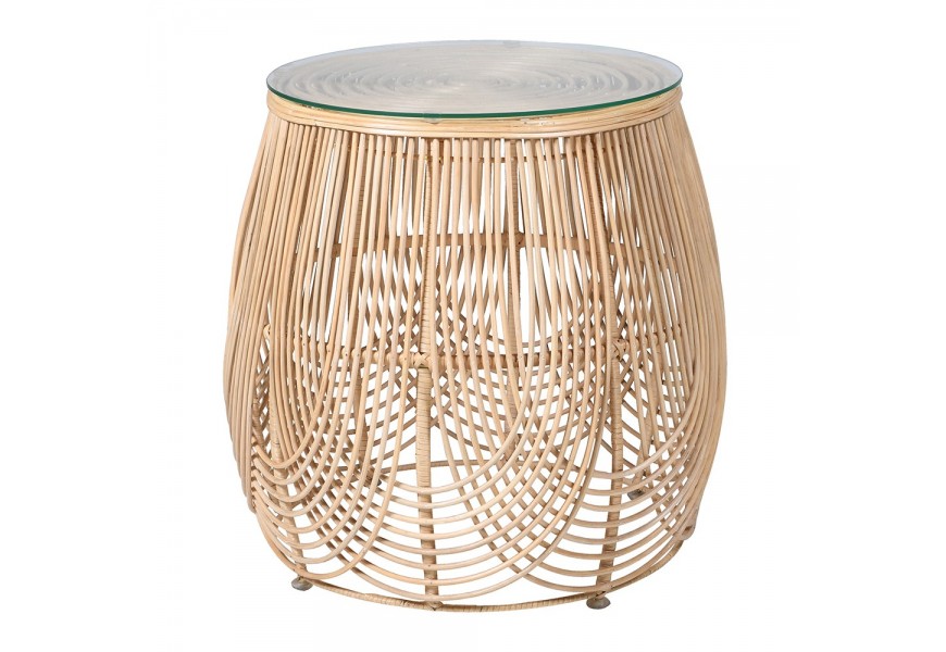 Dizajnový etno príručný stolík Harmony v béžovej farbe z ratanového výpletu s okrúhlou sklenenou doskou 55 cm