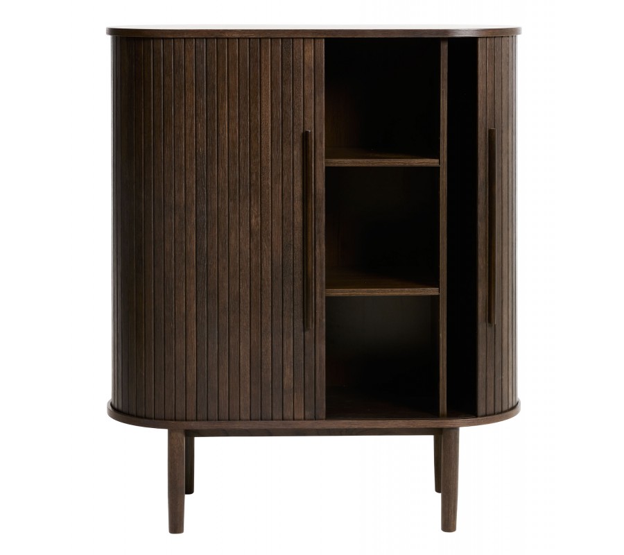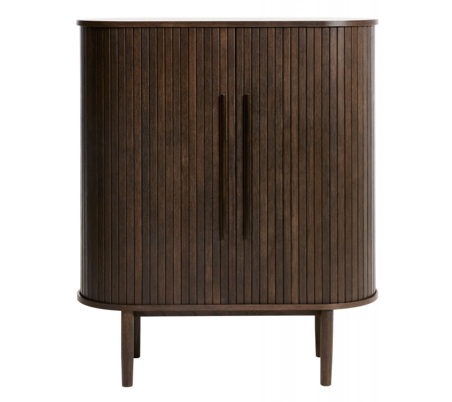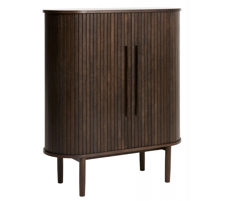 Retro oválna barová skrinka Alborg s dvomi posuvnými lamelovými dvierkami v tmavom hnedom dubovom prevedení 118 cm